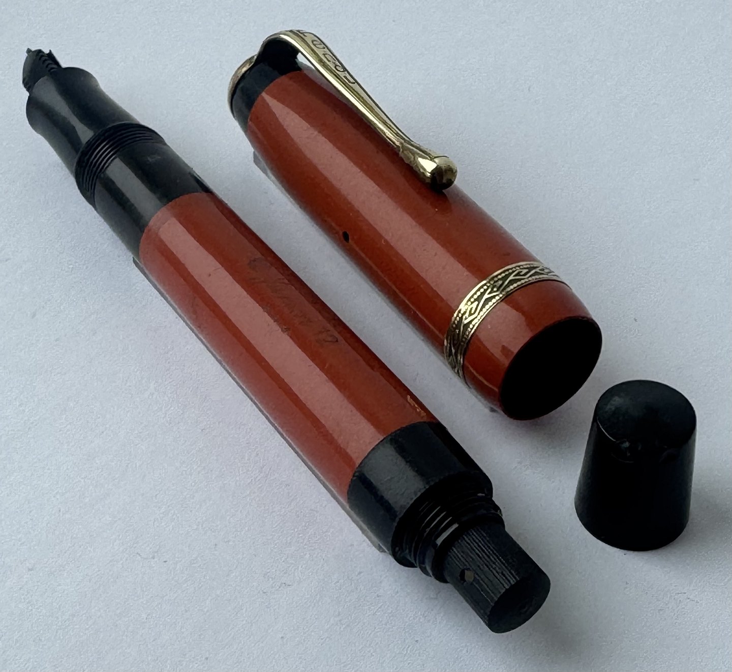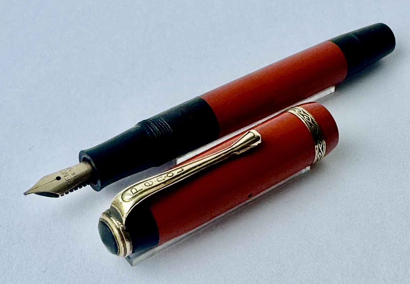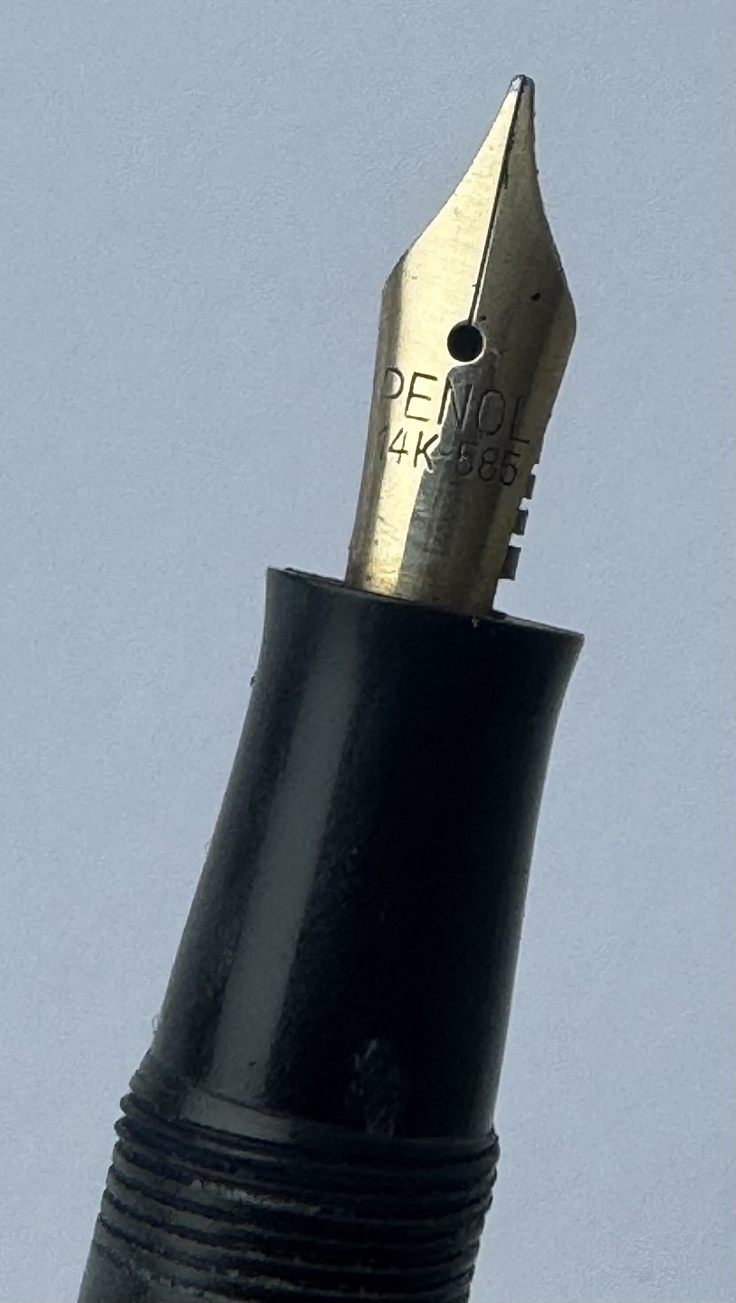 Mindre koralrød Penol Junior 12 fyldepen. Push button filler. Der skal indsættes en ny gummisæk før den igen kan optage blæk og skrive igen. Ny gummisæk kan indsættes for et tillæg på kr. 250,- Alle dele originale til denne model. Ingen skader eller reparationer. Lette almindelige brugsspor på overfladen. Længde 11,7 cm