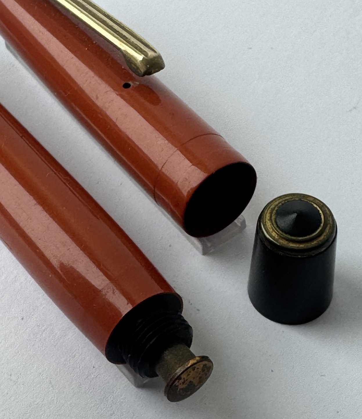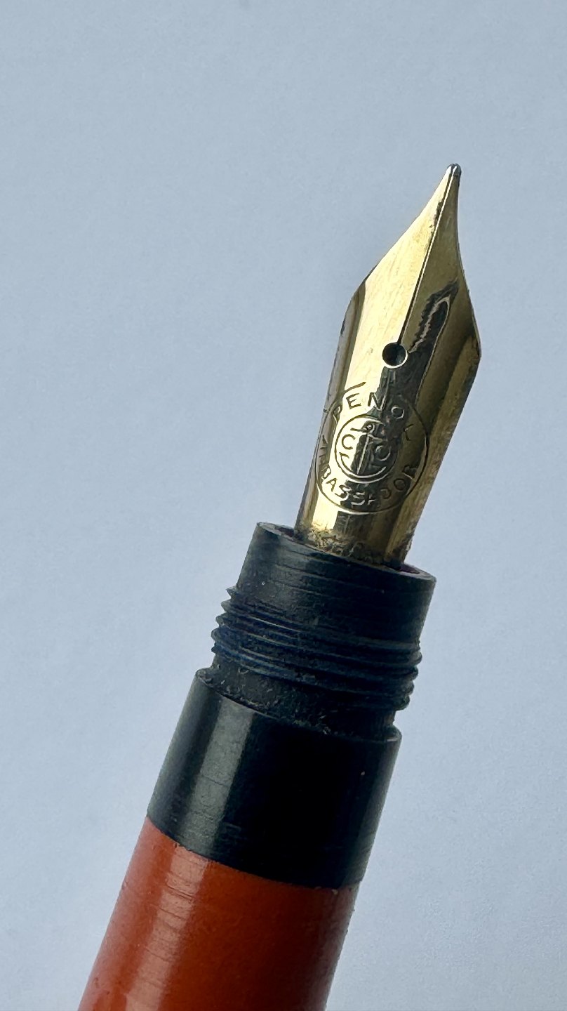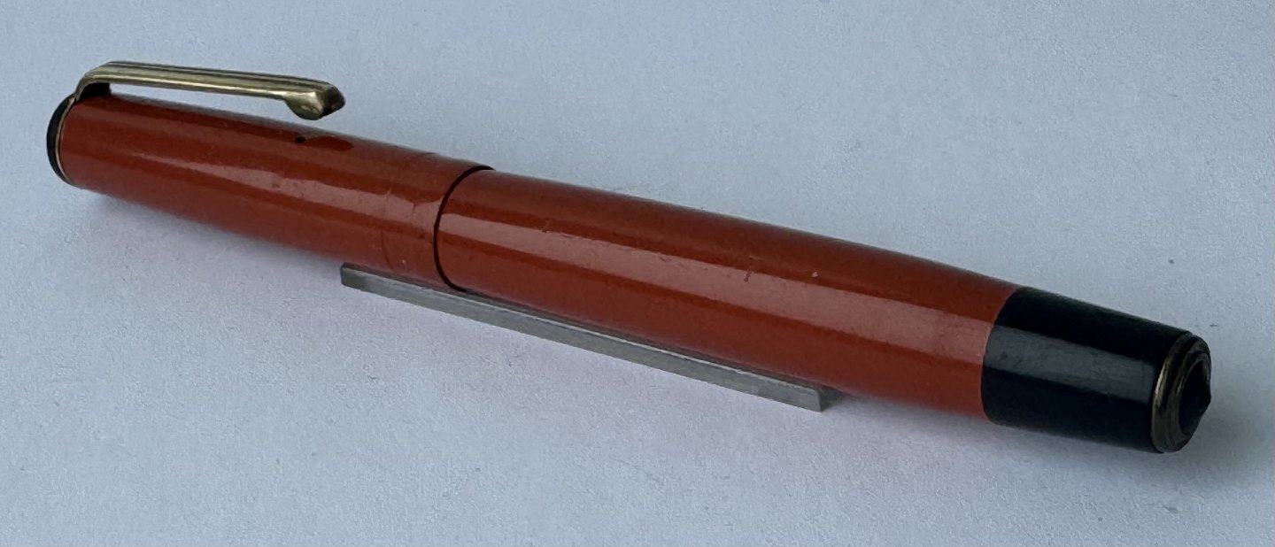 Mindre koralrød Penol-Scout Ambassador fyldepen. Push button filler. Der skal indsættes en ny gummisæk før den igen kan optage blæk og skrive igen. Ny gummisæk kan indsættes for et tillæg på kr. 250,- Alle dele originale til denne model. Ingen skader eller reparationer. Lette almindelige brugsspor på overfladen. Længde 11,7 cm