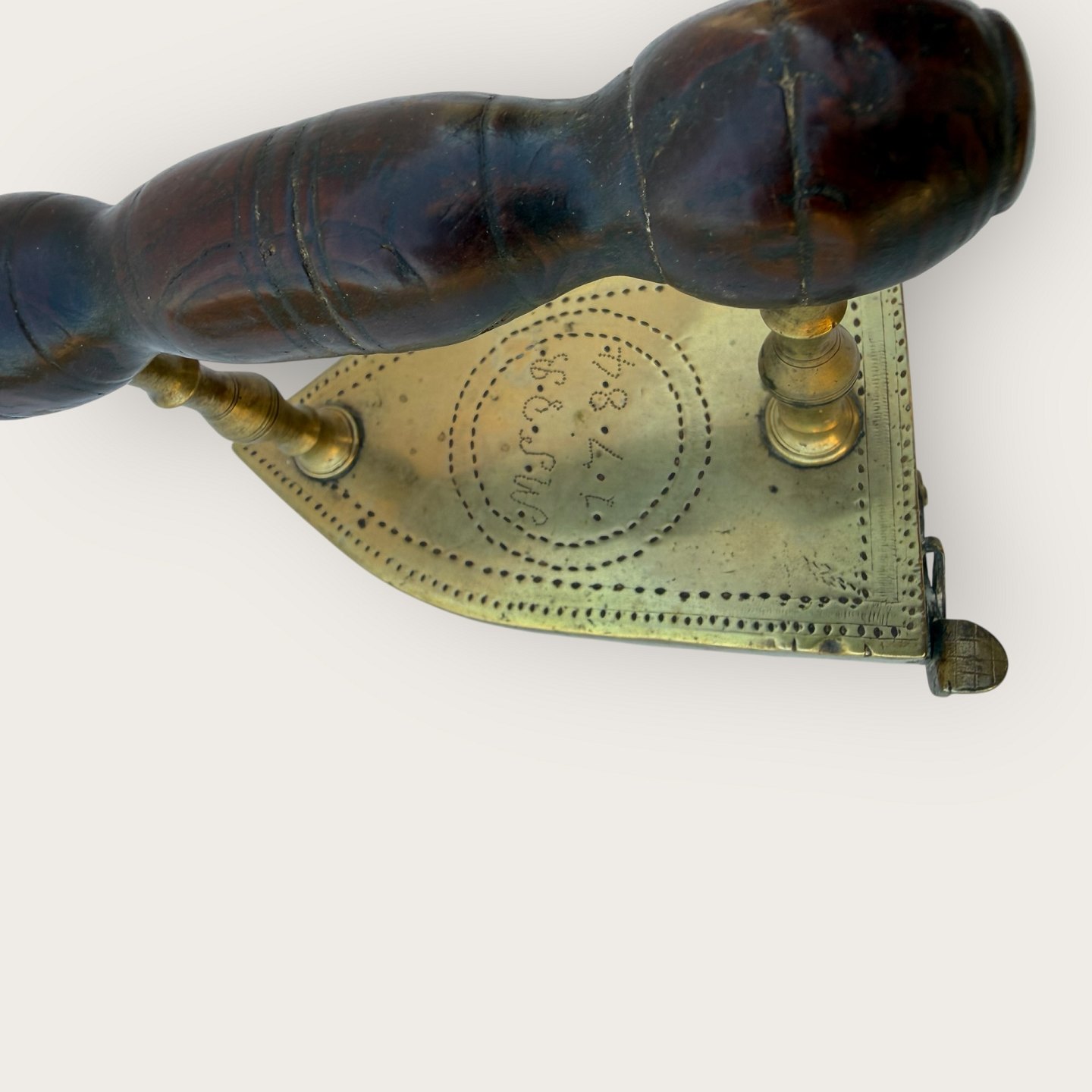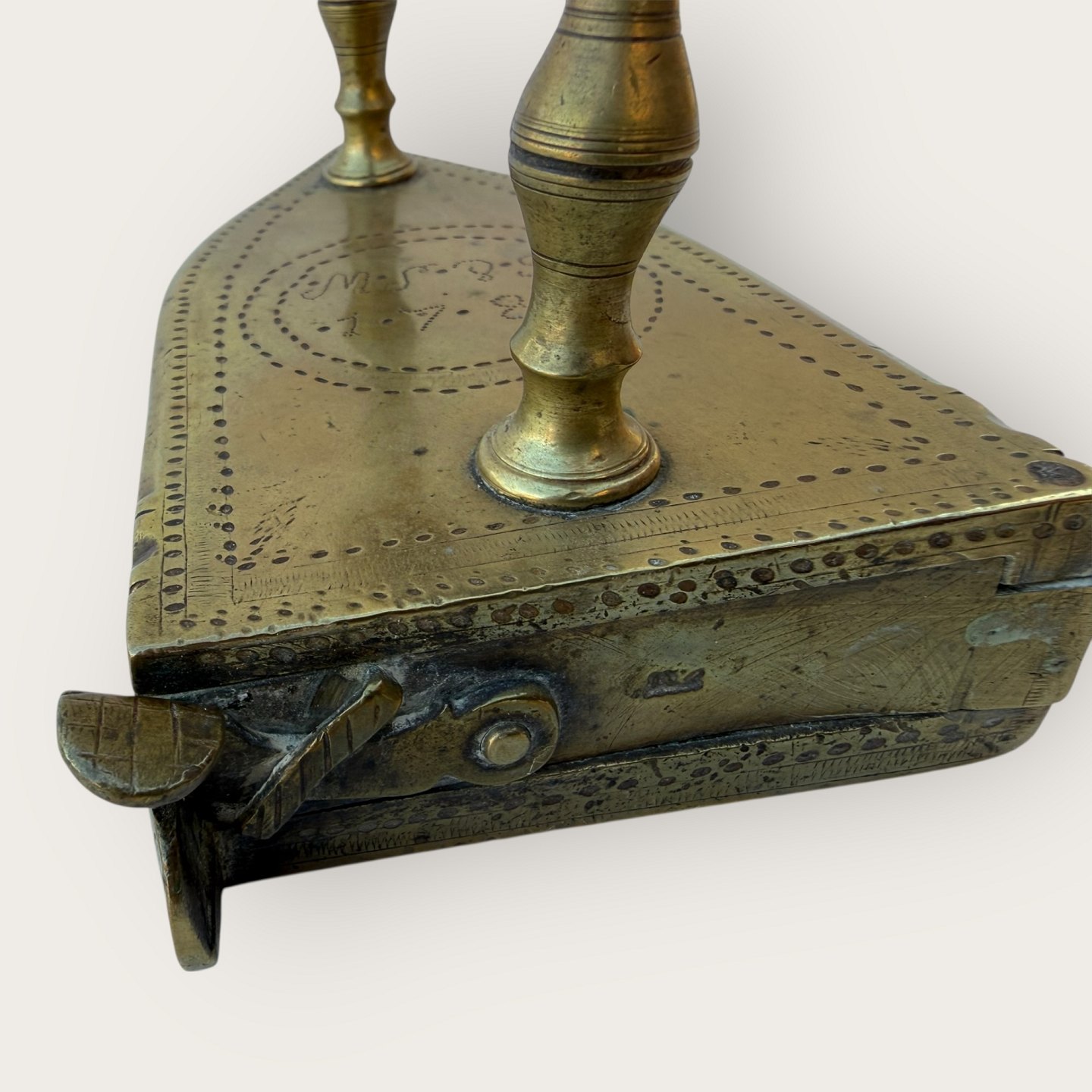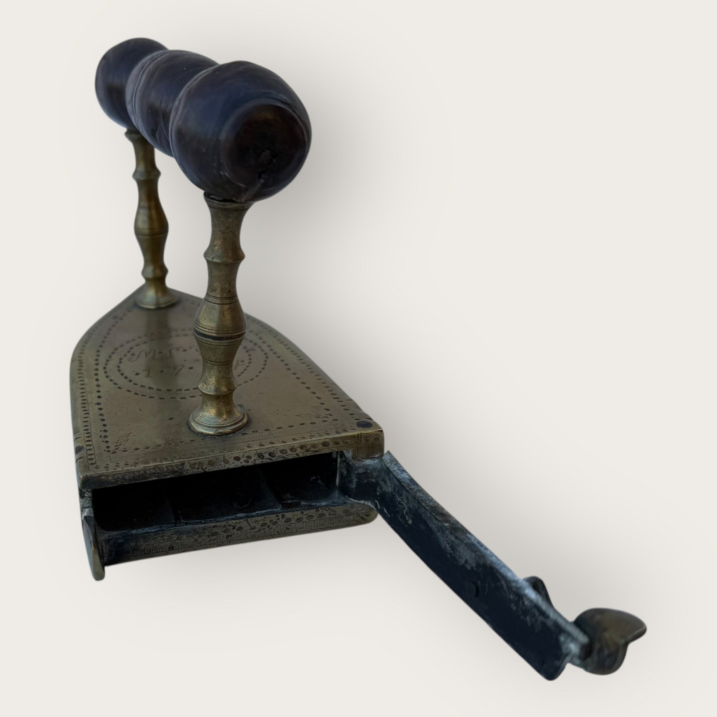 Messing strygejern, mærket med ejerinitialer og 1784, Mål ca.: HxLxb 11x14x8cm *Pæn brugt stand*