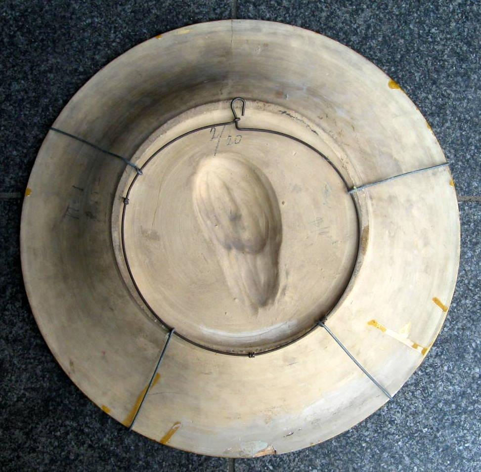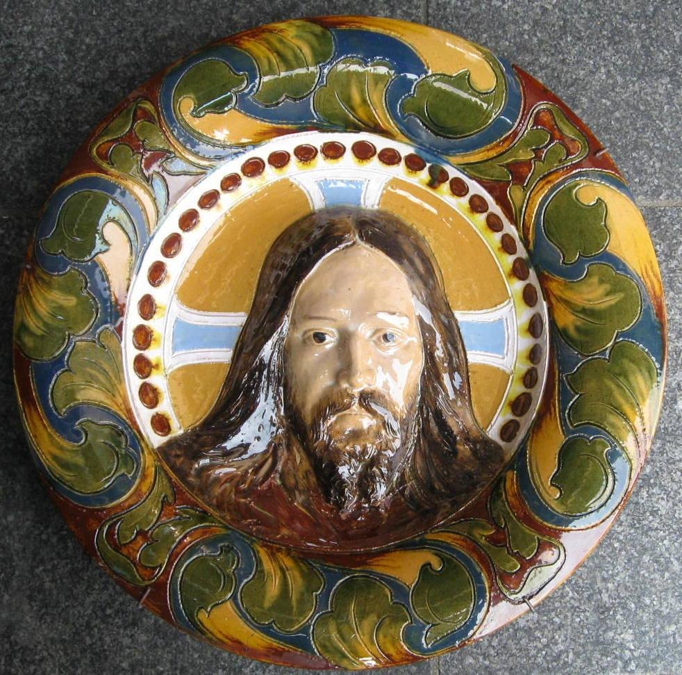 Danish ceramist (19th century) Denmark: Christ. Red clay with glaze. In the colors green, brown, blue, white and light blue. Not signed. Dia.: 40 cm. On the back various pencil drawings, indicating prices in dollars. The work has probably been exhibited in the USA. With repairs.