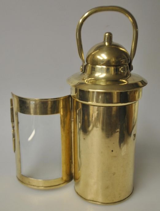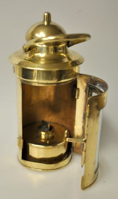 Antik rund olie lampe med hank, messing, 19. årh. Indvendig med beholder til brændstof. Højde med hank: 23 cm.