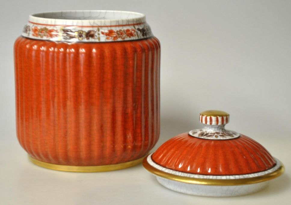 Dahl Jensen lågkrukke i craquelle, 225/666, 20. årh. København, Danmark. Håndmalet med blomstermotiver, rødt og forgyldninger. Stemplet. H.: 16 cm. Dia: 11,5 cm.