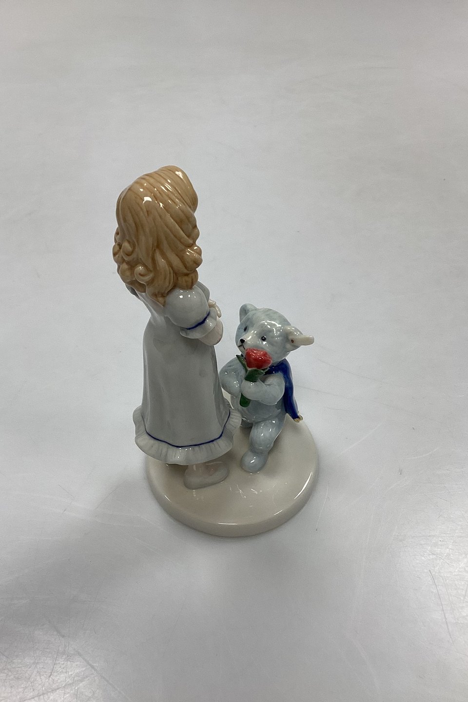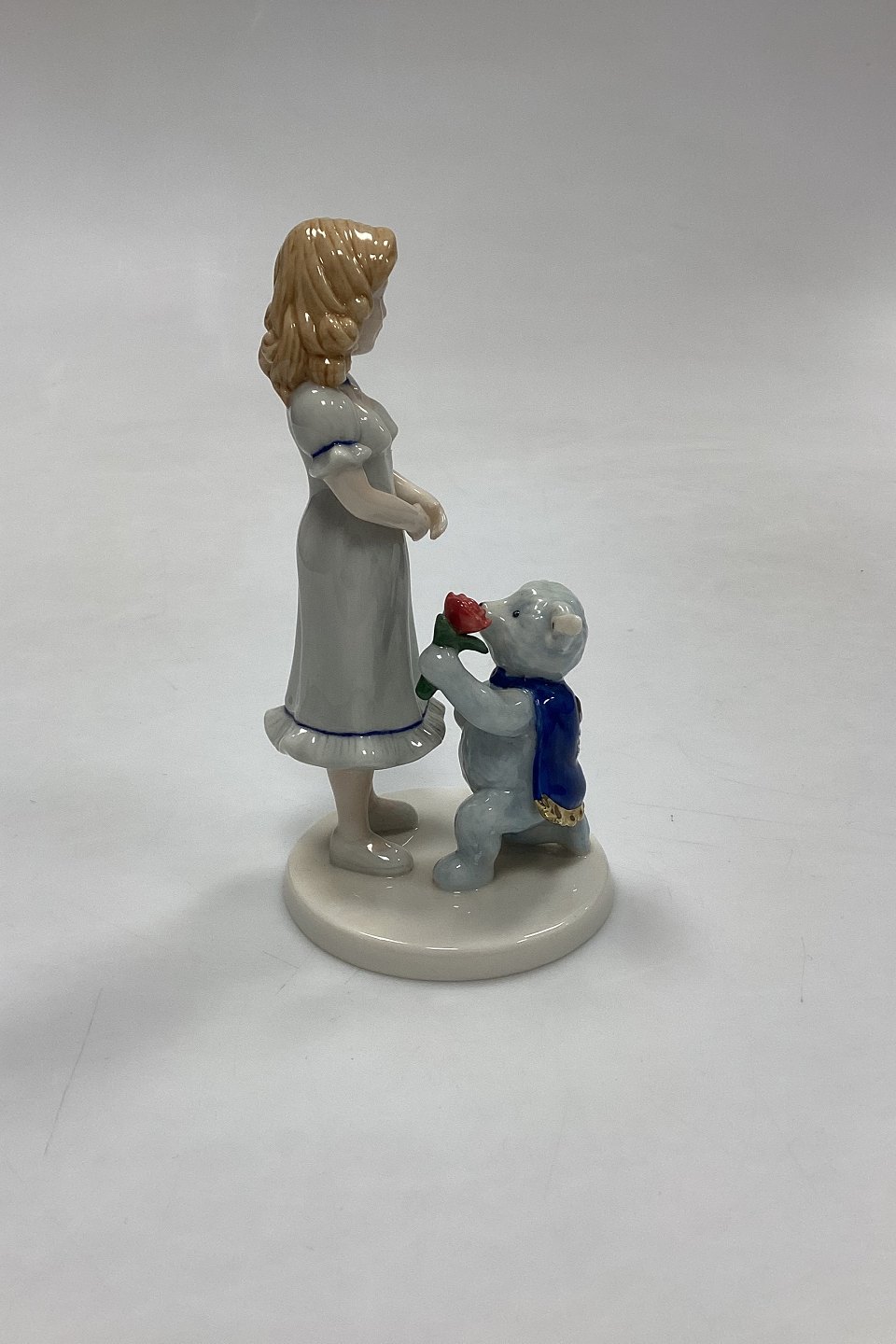 Royal Copenhagen Figurine - Snowwhite Rosered. Motif from the fairy tale Snowwhite and Rosered with a wooing Steiff Teddy Bear. Collaboration between the two companies with the inscription: Snowwhite Rosered Steiff / Button in ear.