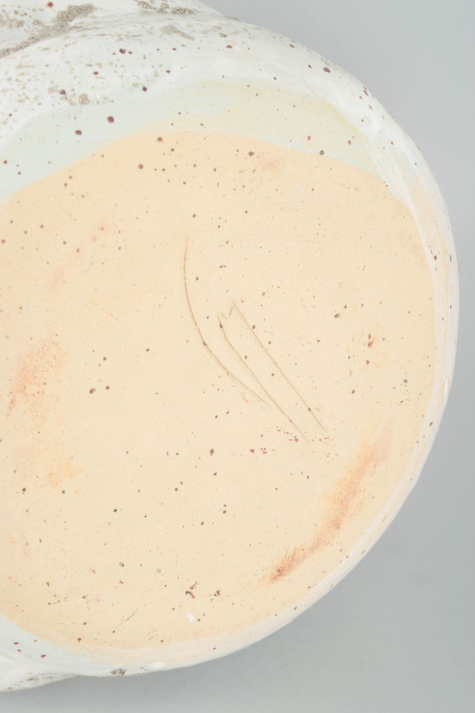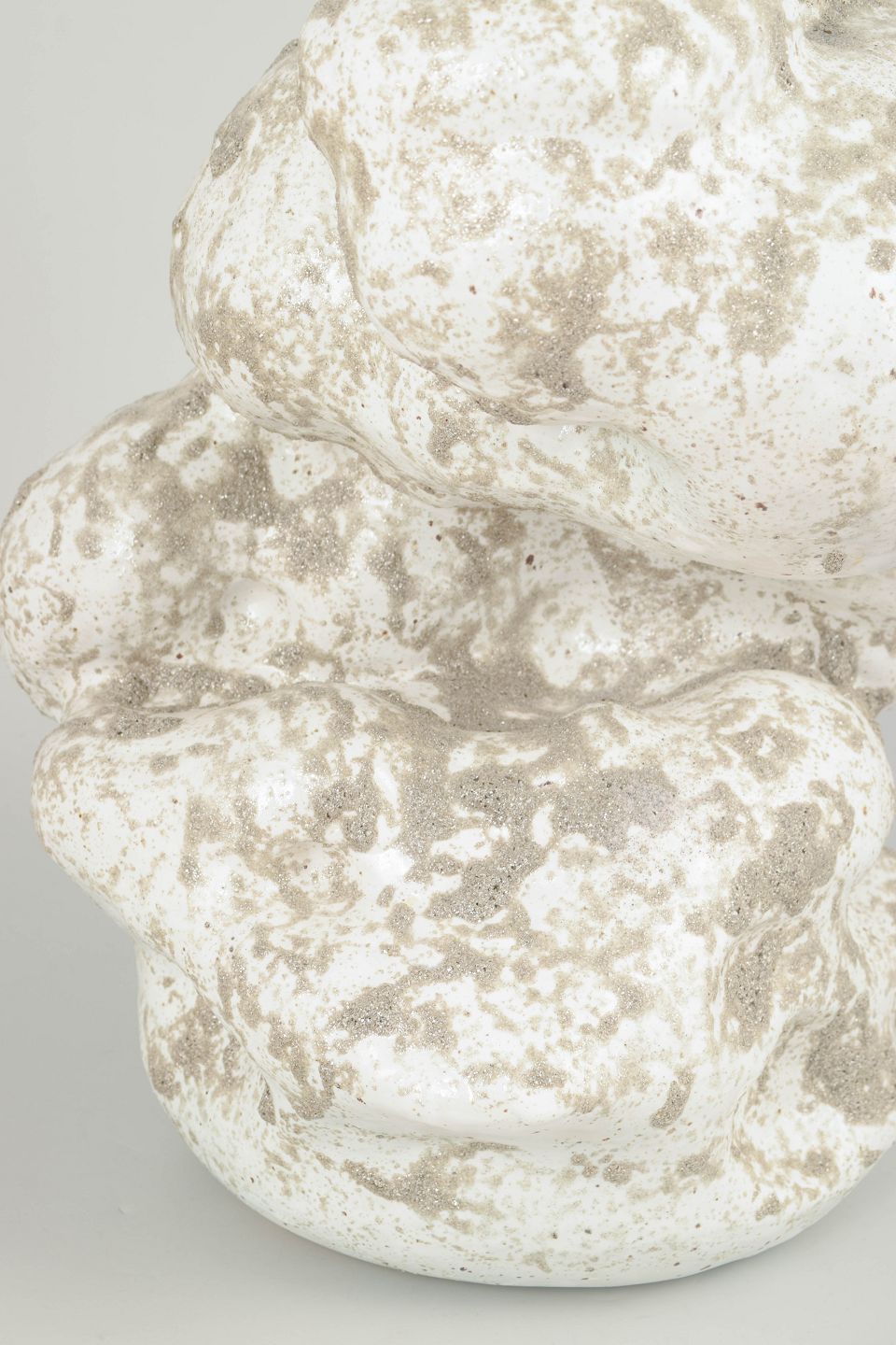 Høj unika stentøjsvase, organisk formet. Glasuren er en hvid blank med grå, mat glitter glasur, der henleder tankerne på vådt sand.