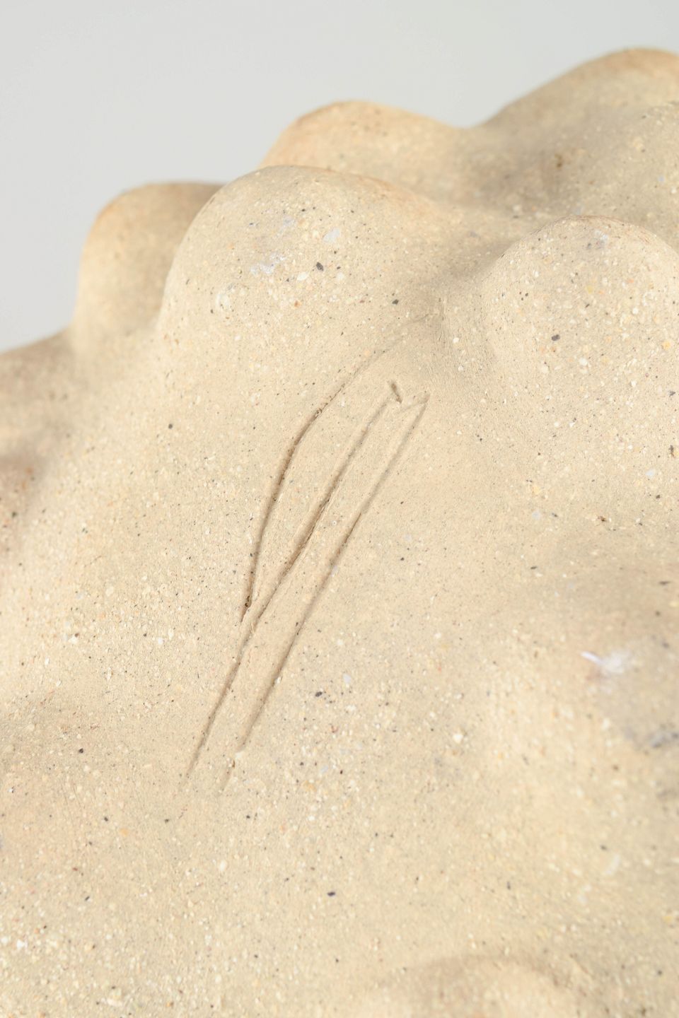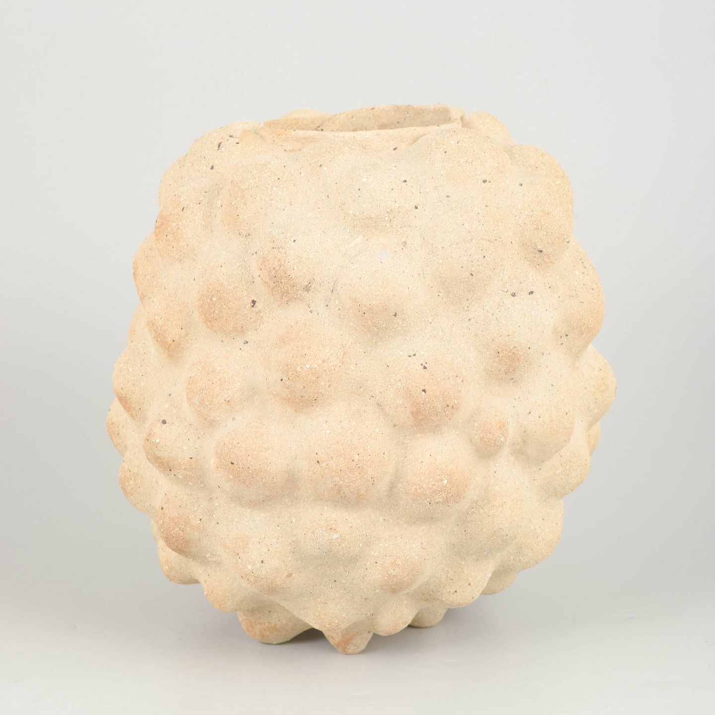 Unika stentøjsvase, organisk formet. Værket er uglaseret i kunstnerens signaturstil, hun har udarbejdet en teknik hvor leret vaskes ned så chamotten (små sorte og hvide emner i leret) fremstår meget synligt og får leret til at virke råt og smukt.