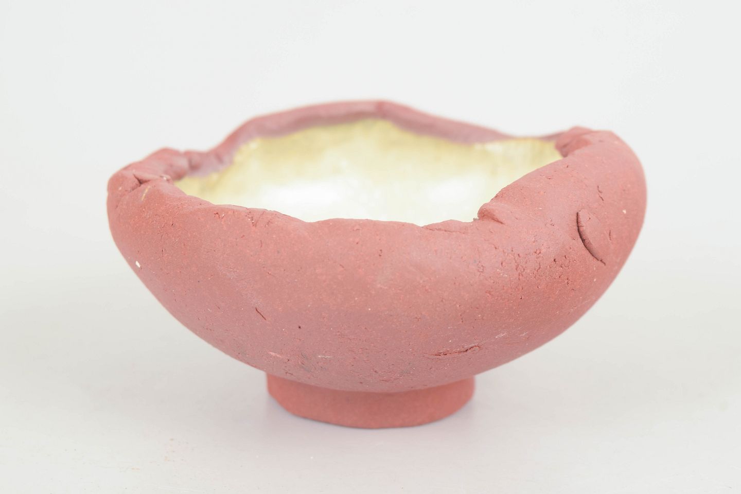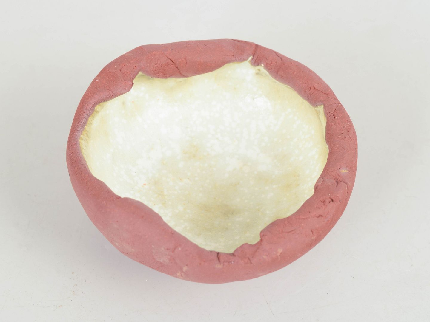 Lille bitte unika skål i rødt stentøjsler på fod. Uglaseret på ydersiden fremstår den med det røde, varme ler som en kontrast til den cremehvide krystalglasur der optræder indvendigt.