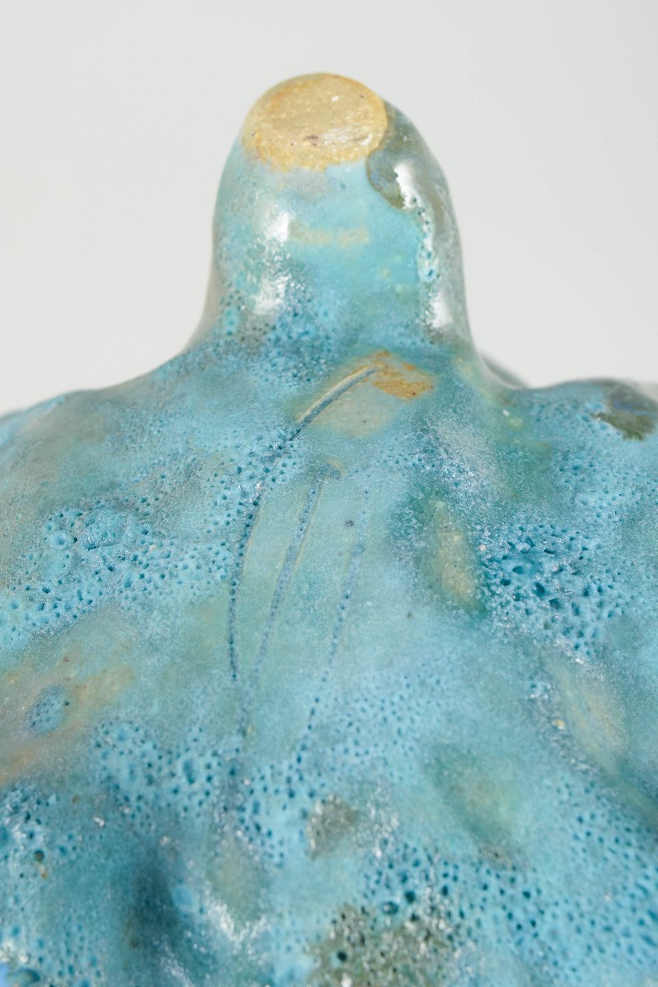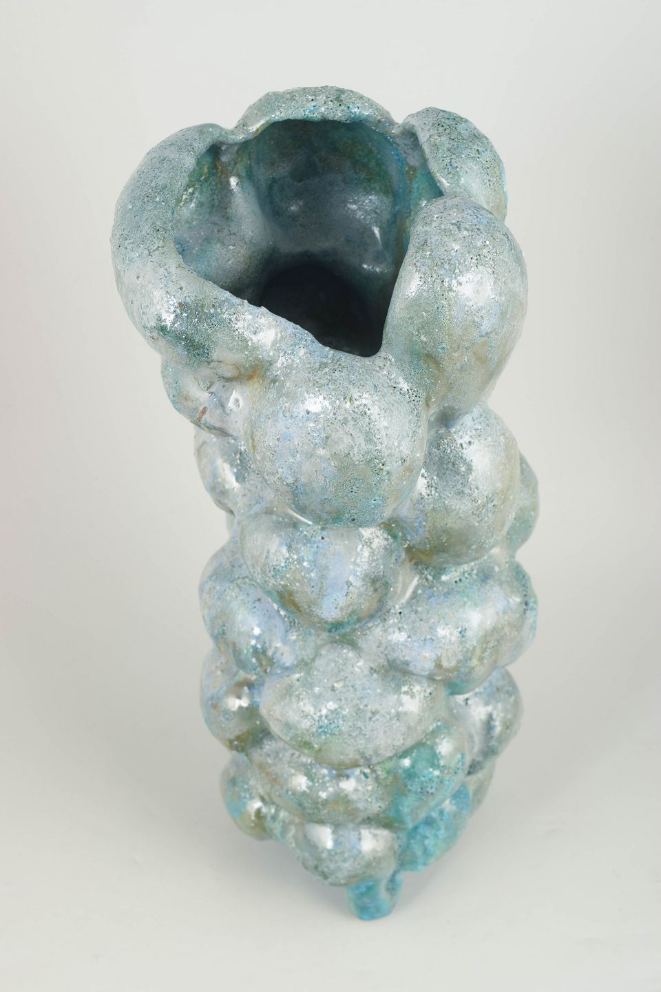 Høj, slank unika stentøjsvase. Glasuren er en grønlig turkis med blå toner og tekstureret overflade. Vasen står på tre integrerede fødder. Denne skulptur er en del af 'Salt' serien af Christina Muff.