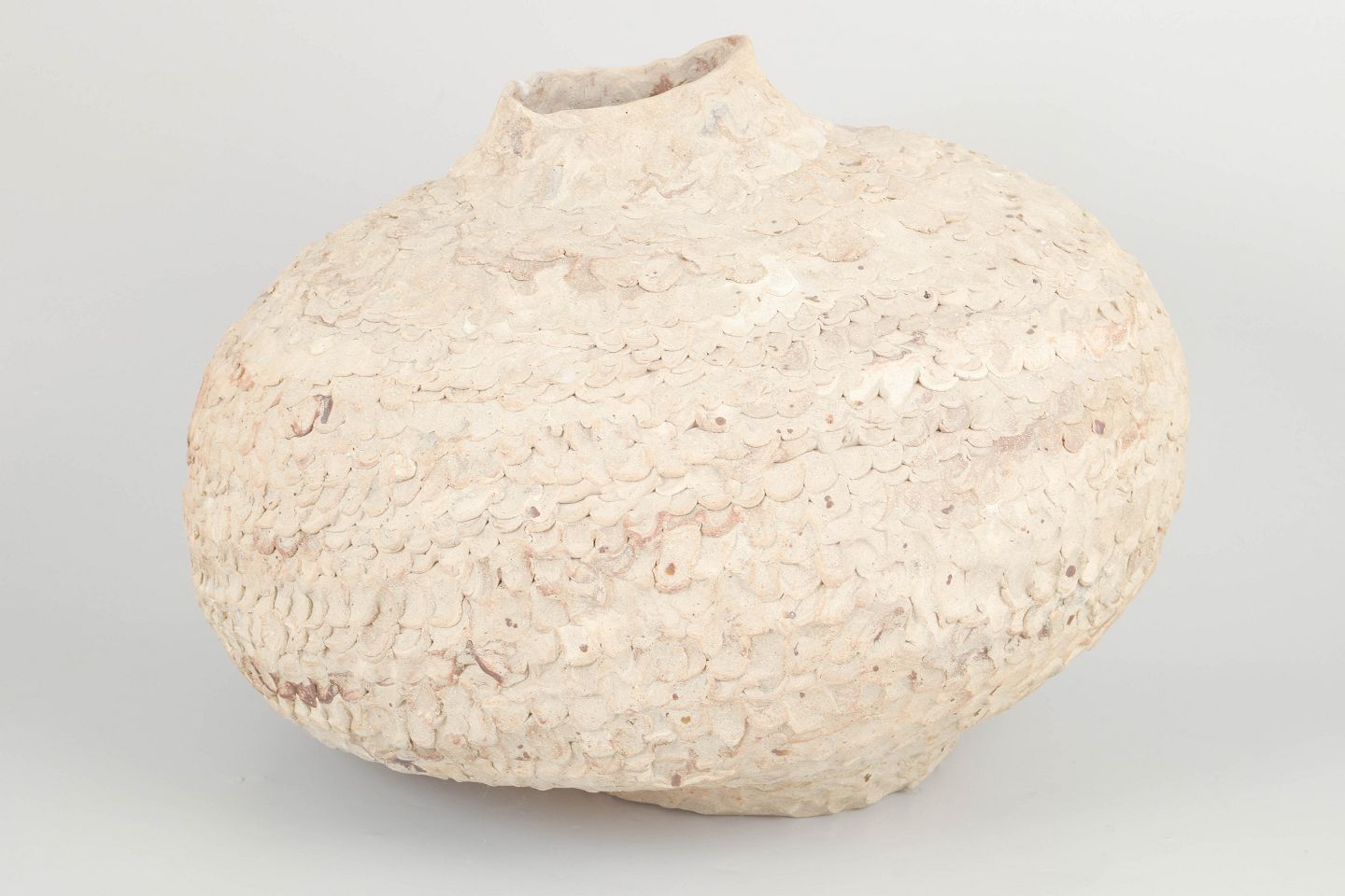 Stor unika rund stentøjsvase. Værket er uglaseret i kunstnerens signaturstil med blandede lertyper. Leret er genbrugsler, der er sammensat med tusindvis af kunstnerens tryk med fingrene, dette giver værket et taktilt, organisk og blødt udtryk. Kan ikke holde væske.