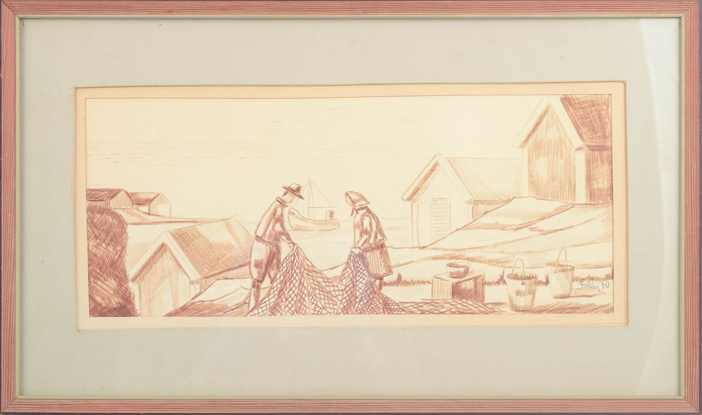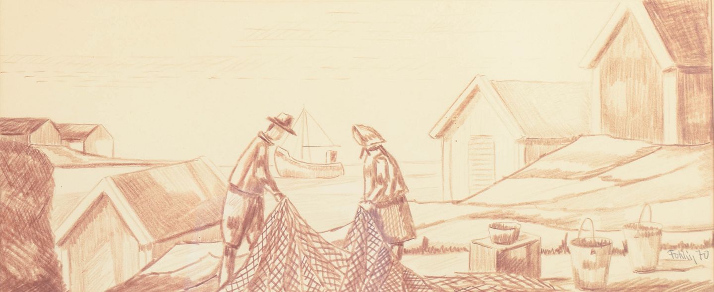 Figurativ komposition udført som blyanttegning med motiv af to fiskere, der arbejder med et net i et kystlandskab med både og huse i baggrunden.