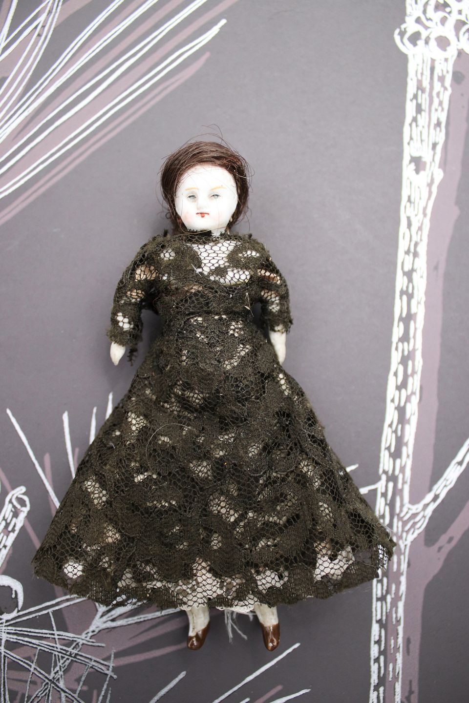 2) H: 13,5cm. Pige med hoved , hænder og fødder i porcelæn , krop i stof og iklædt gammel blondekjole - PRIS: 500 Kr. RESERVERET !