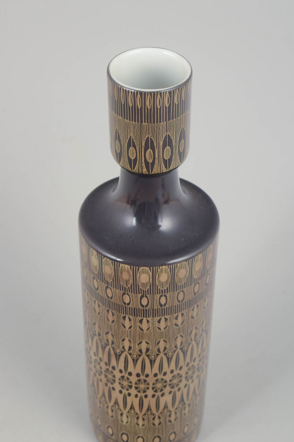 Slank porcelænsvase med høj hals og rig gulddekoration i geometrisk mønster på mørk baggrund, typisk for Rosenthals dekorative produktion i slutningen af det 20. århundrede.
