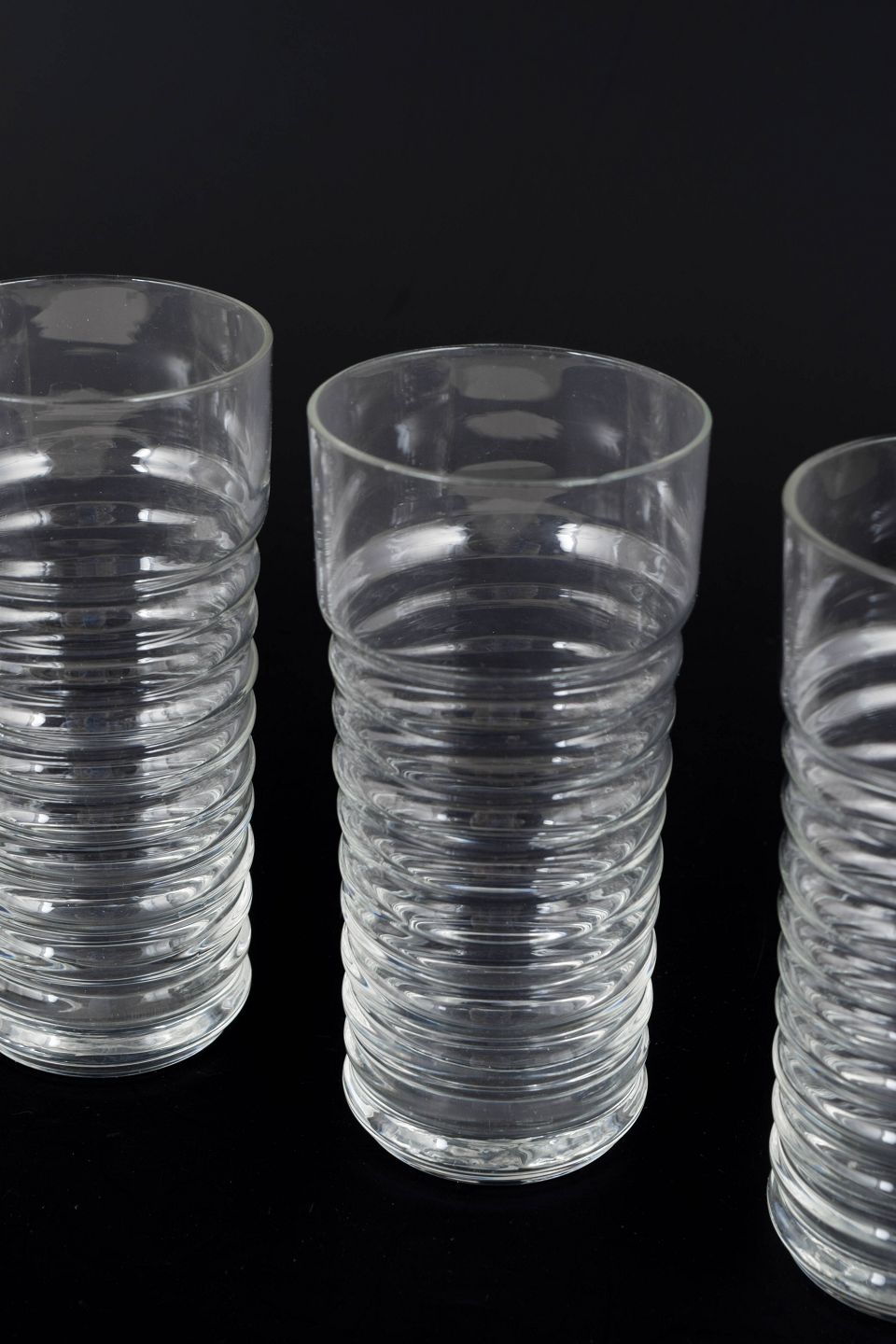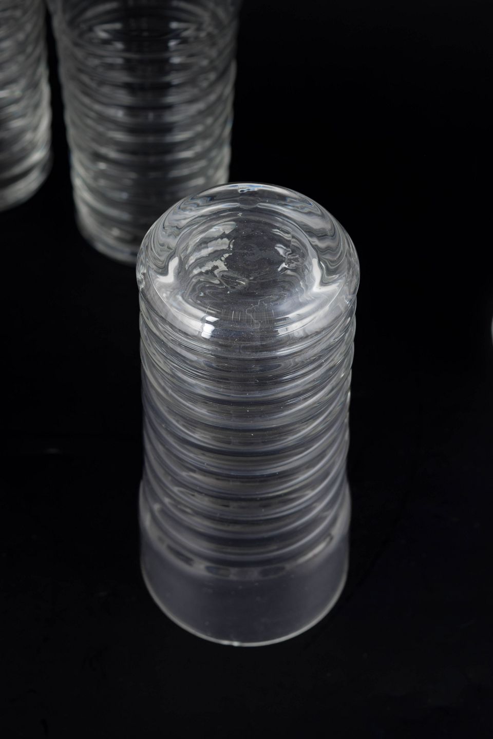 Klar glas i Perpetum Mobile serien med karakteristisk rillet struktur og cylindrisk form.