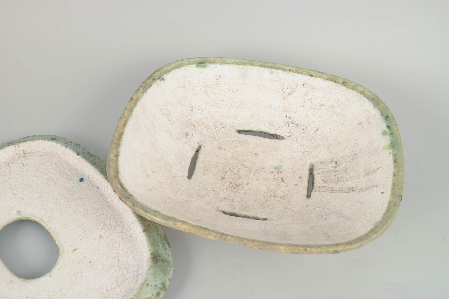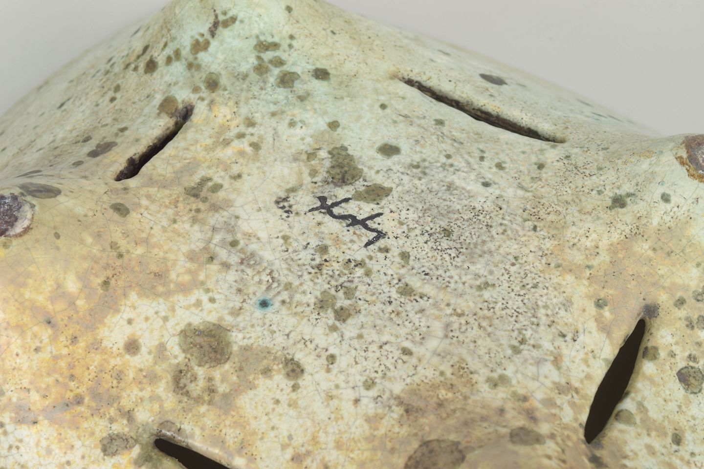 Organisk formet lågskål i stentøj med karakteristisk plettet glasur i lyse, jordnære toner. Skulpturel form med bløde linjer og låg med åbning, typisk for Hans Hedbergs keramiske arbejder fra Biot.