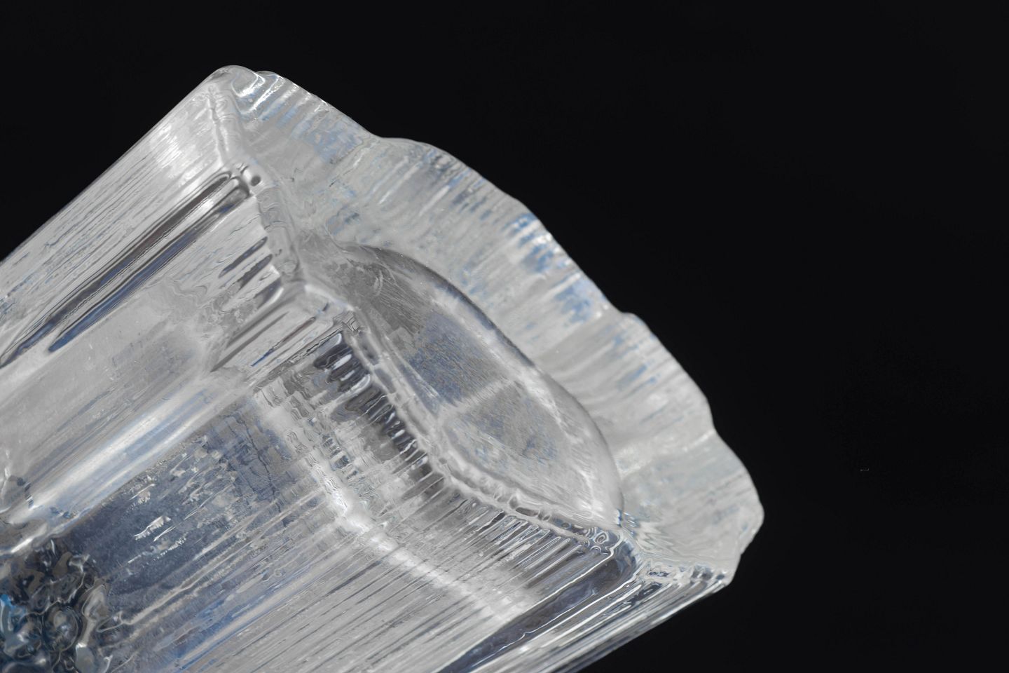 Klar glasvase med karakteristisk is-struktureret bælte omkring midten og lodrette slebne flader. Organisk form med let bølget kant.
