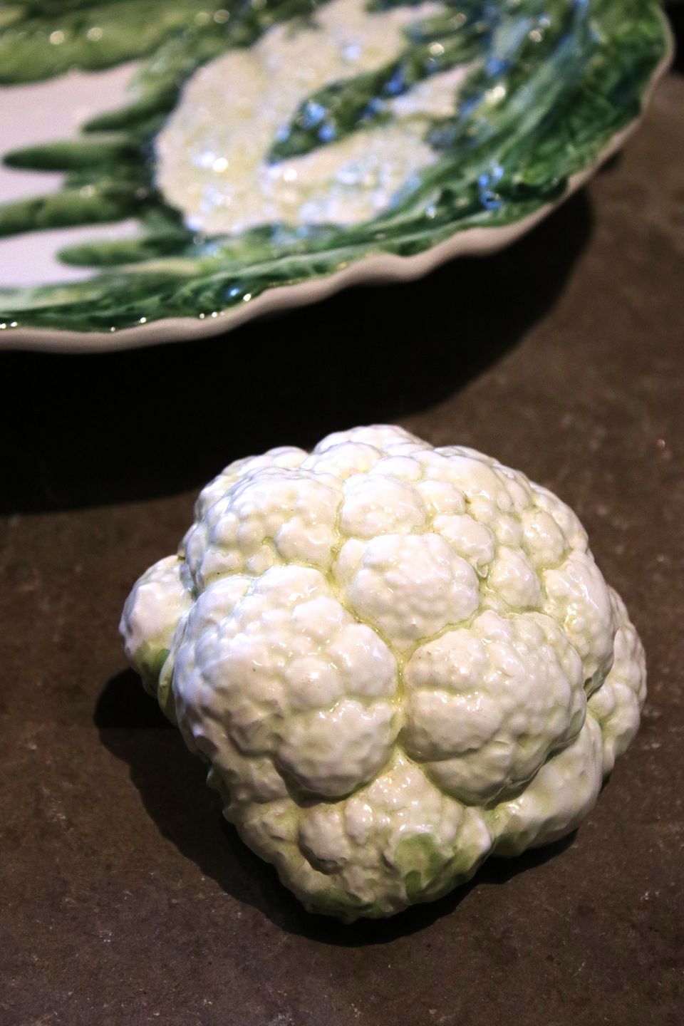 Dekorative , gamle italienske fajance grøntsager , et blomkålshoved og en artiskok...