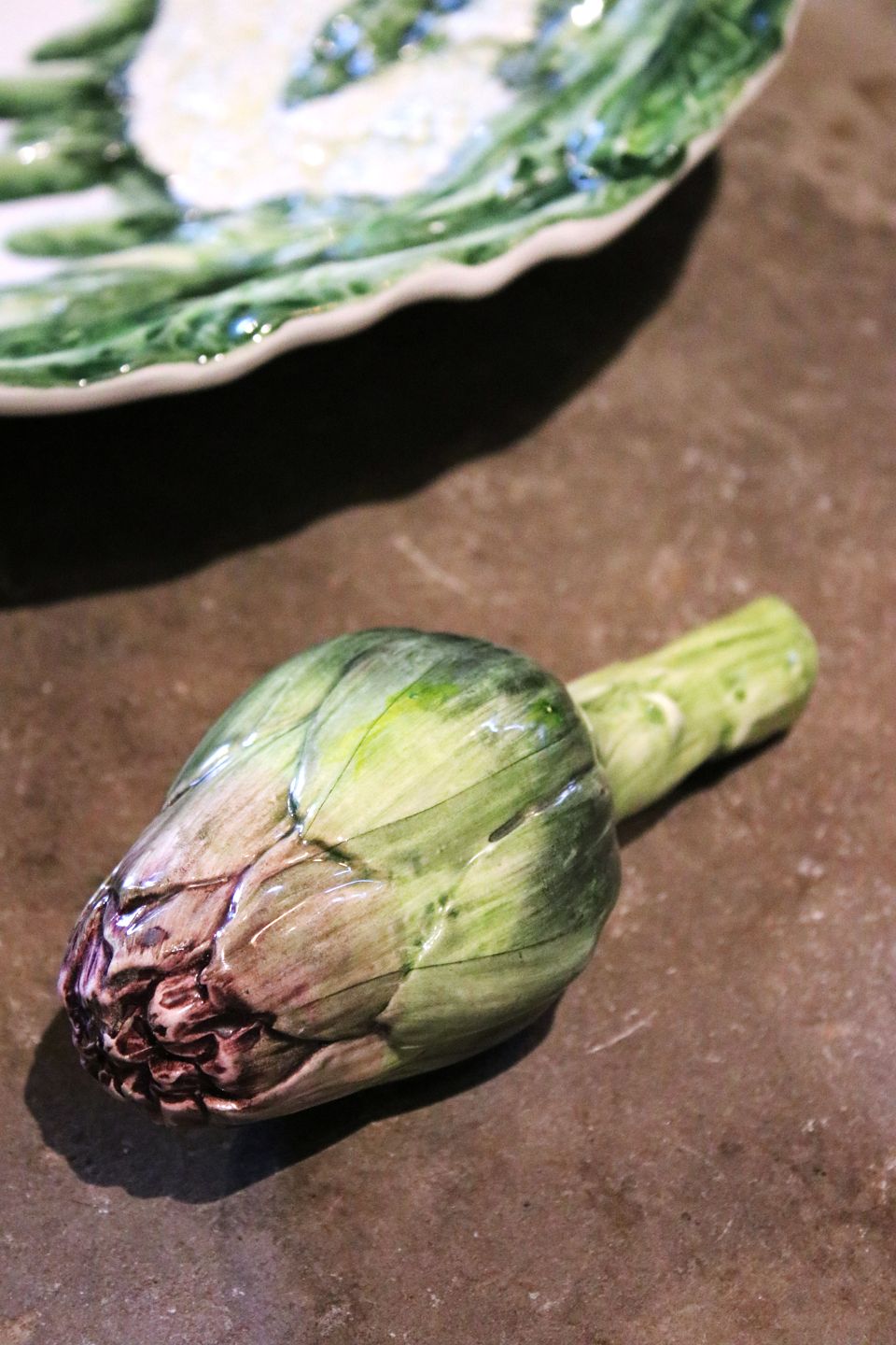 Dekorative , gamle italienske fajance grøntsager , et blomkålshoved og en artiskok.