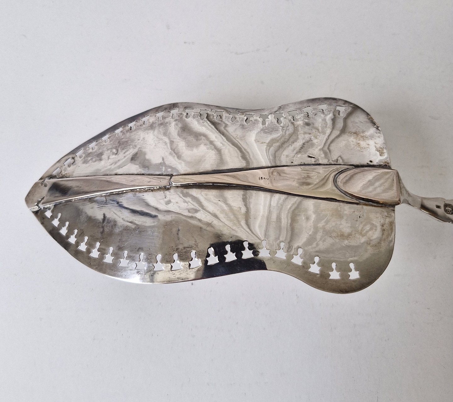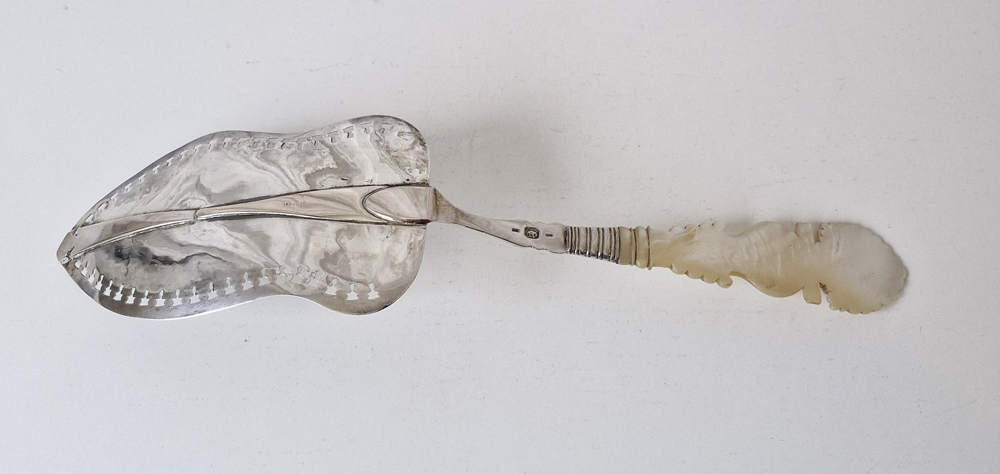 Stor fiskespade i sølv med perlemors håndtag. Sølv laf med gennembrudt kant, smukt dekoreret med en engel og blomster. Perlemors håndtaget er smukt udskåret med en påugl.
