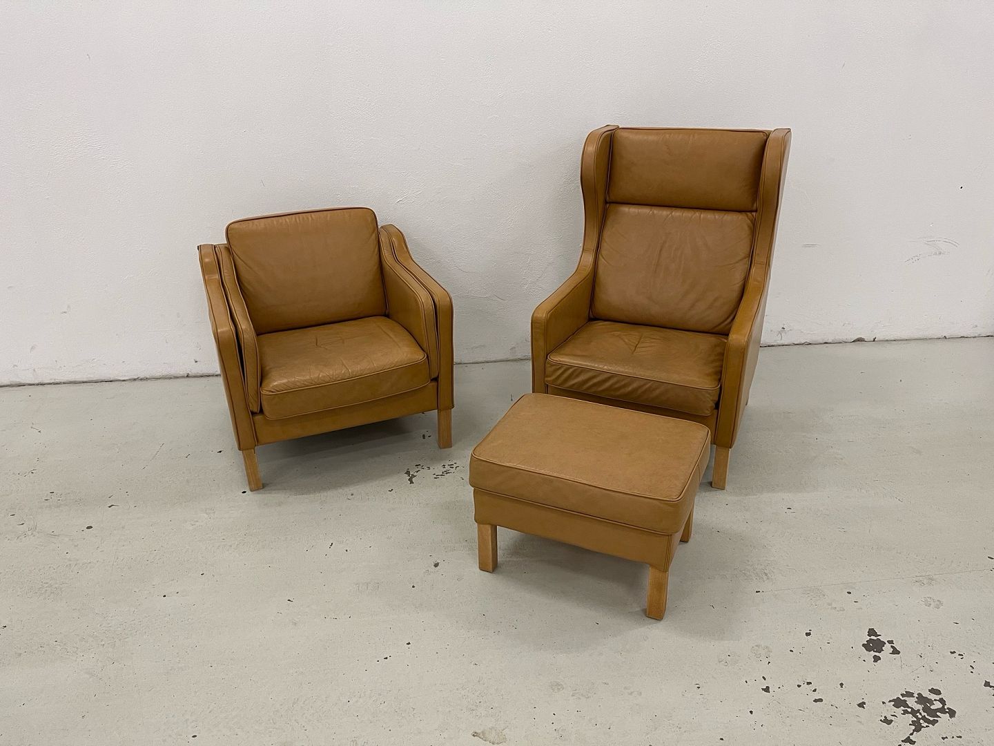 Eksklusivt sæt bestående af Skalma Cerena øreklapstol, lav stol og skammel, udført i semianilin cognacfarvet læder (668/08) med ben i lys sæbebehandlet bøg.