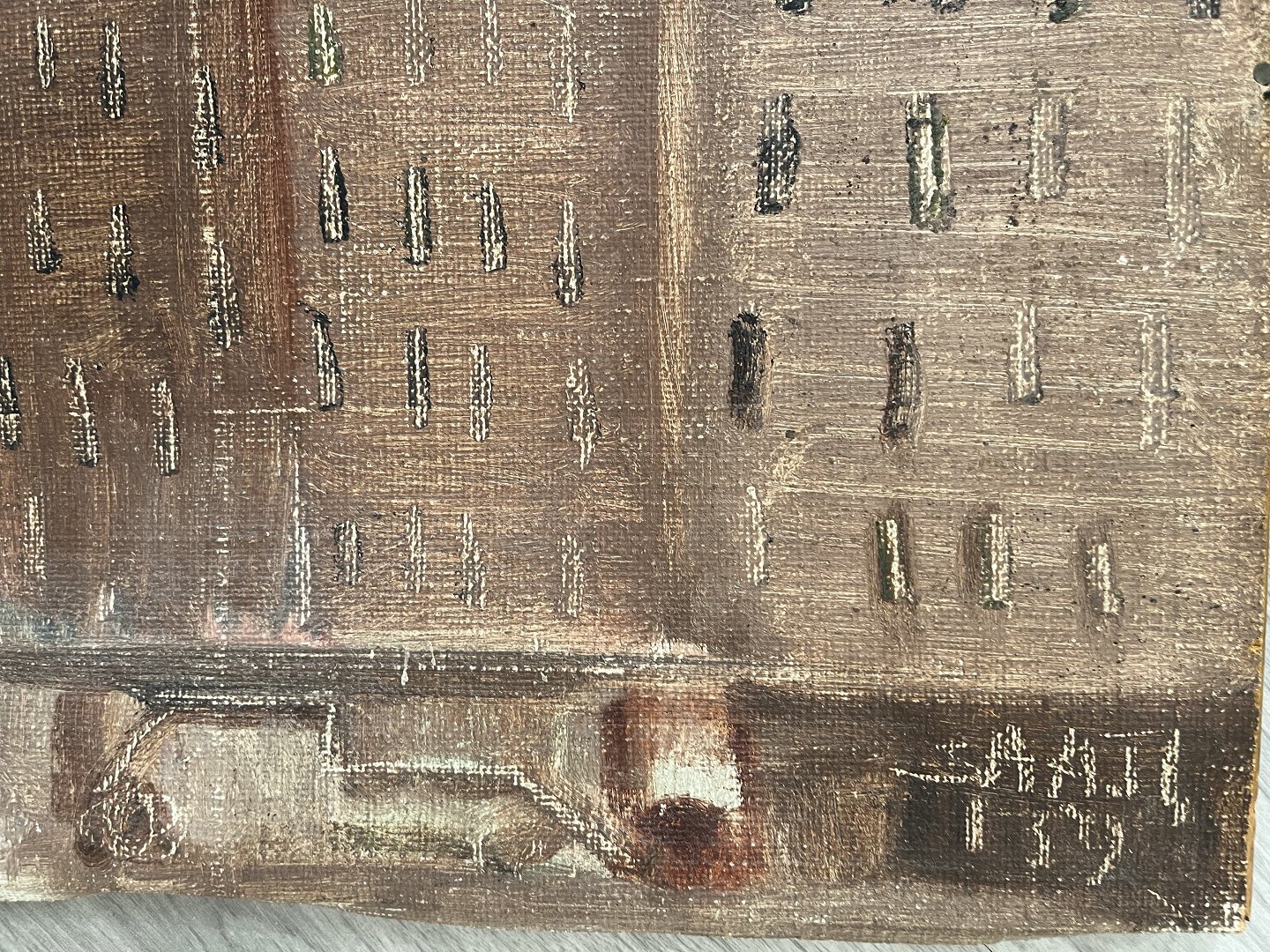 Maleri af Svend Aage Tauscher - Byparti med bil og personer 1959.