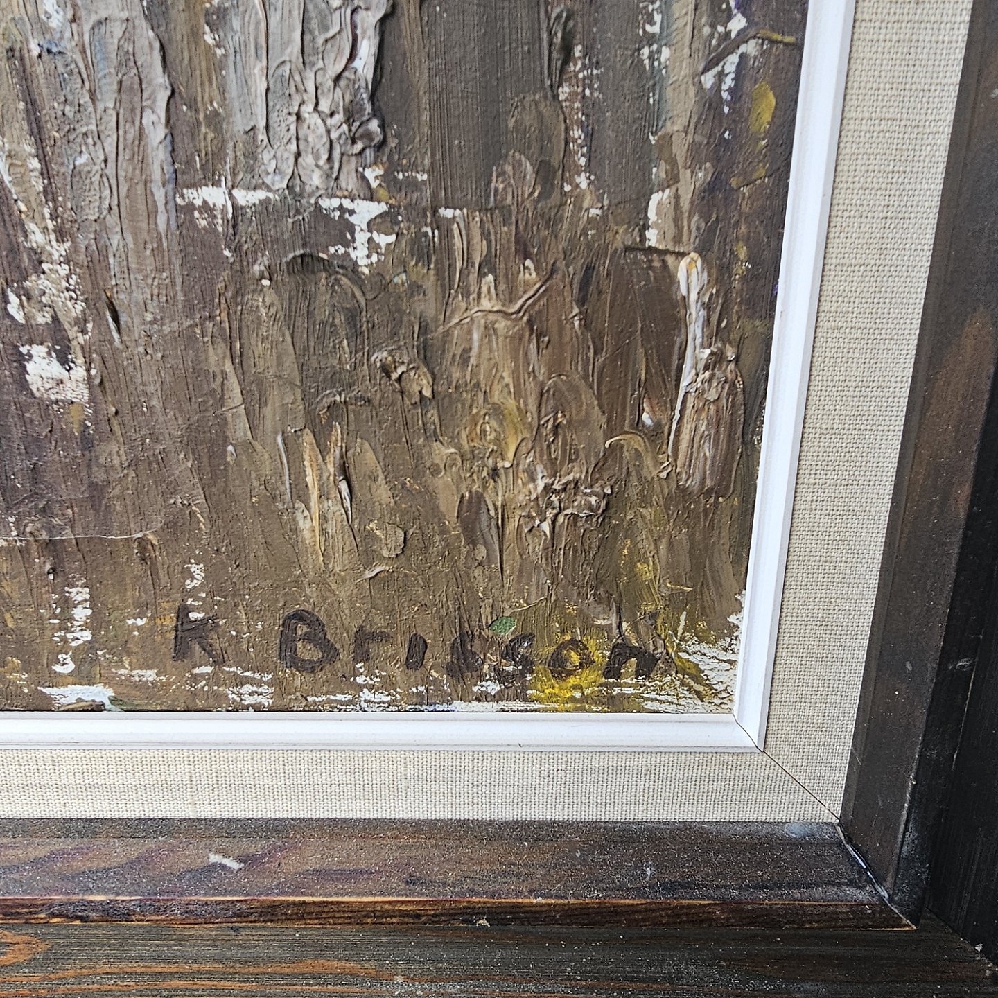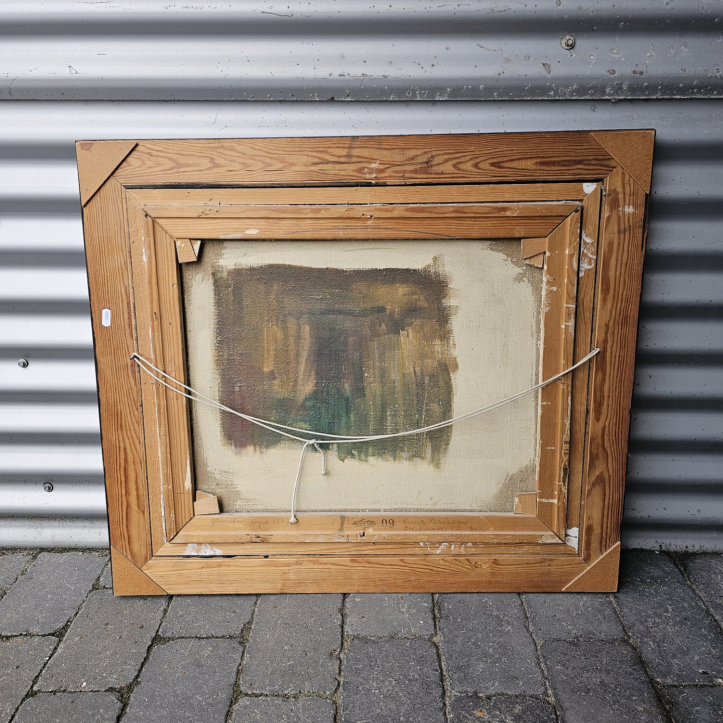 Oliemaleri på lærred med titlen Granskov. Monteret i sortmalet ramme med motiv af en sti gennem grantræer, dateret 1960