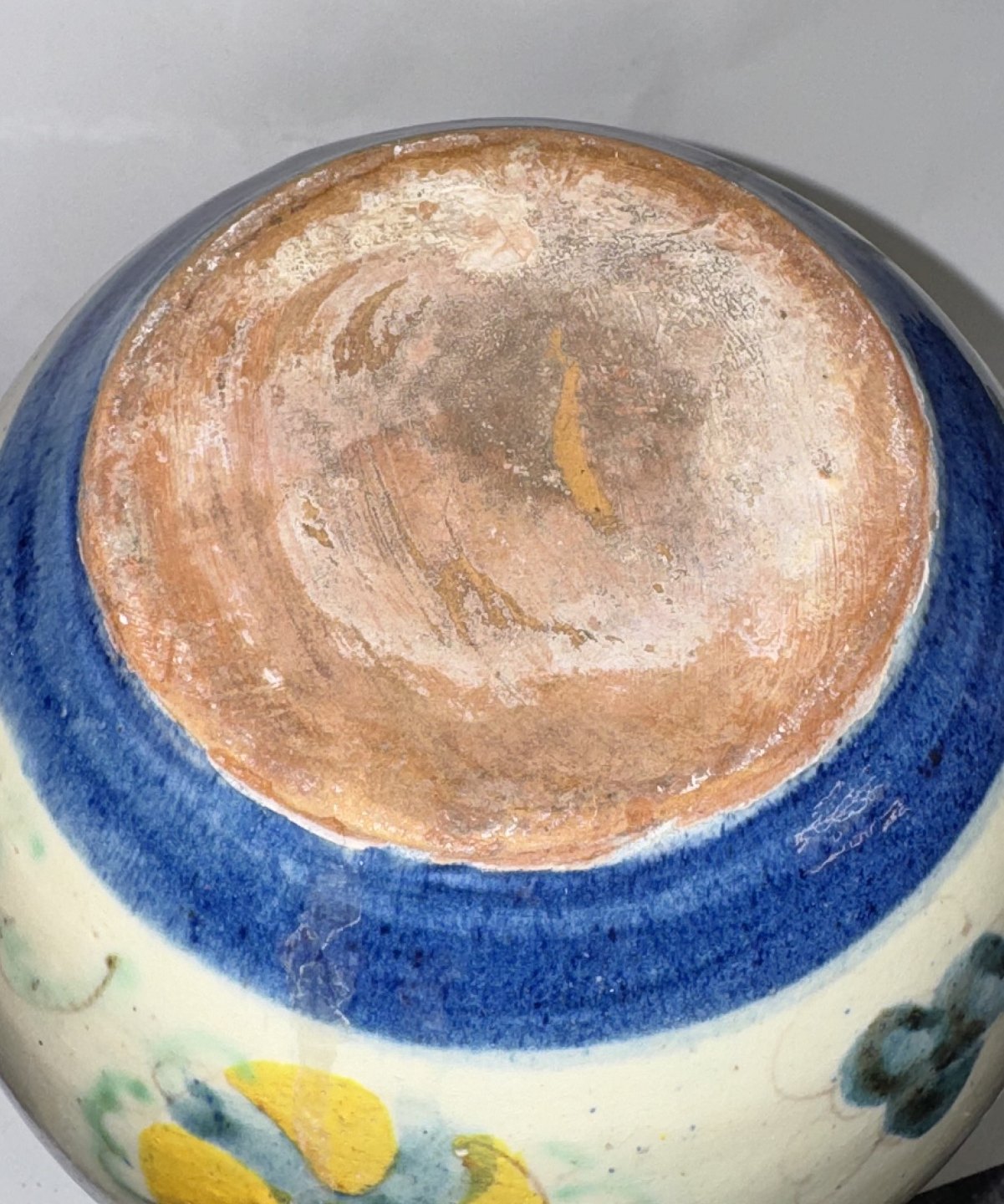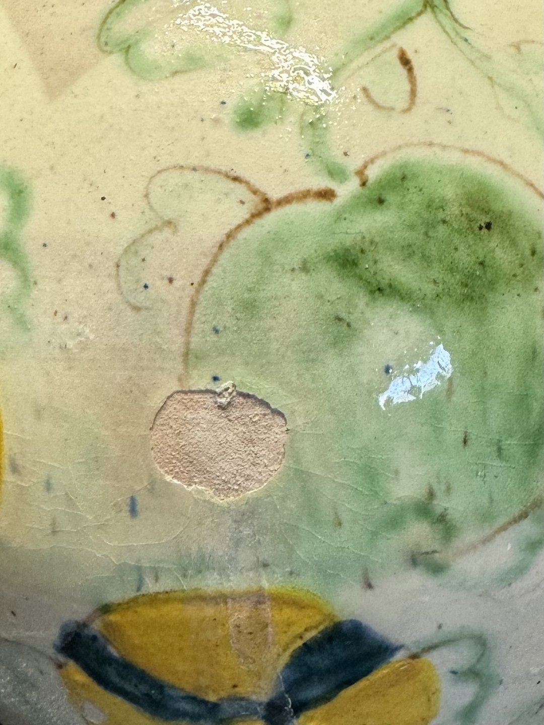 Vase i keramik (lertøj) med frugt motiv. Tilskrives Anders Høy fremstillet i begyndelsen af 1930’erne. Lille plet med manglende glasur (ikke et skår) på kanten øverst. Mindre, cirkelrund, glasur mangel ved et æble (se foto). Fin dekoration af forskellige frugter bl.a druer og æbler. Typisk Anders Høy stil. H. 18 cm.