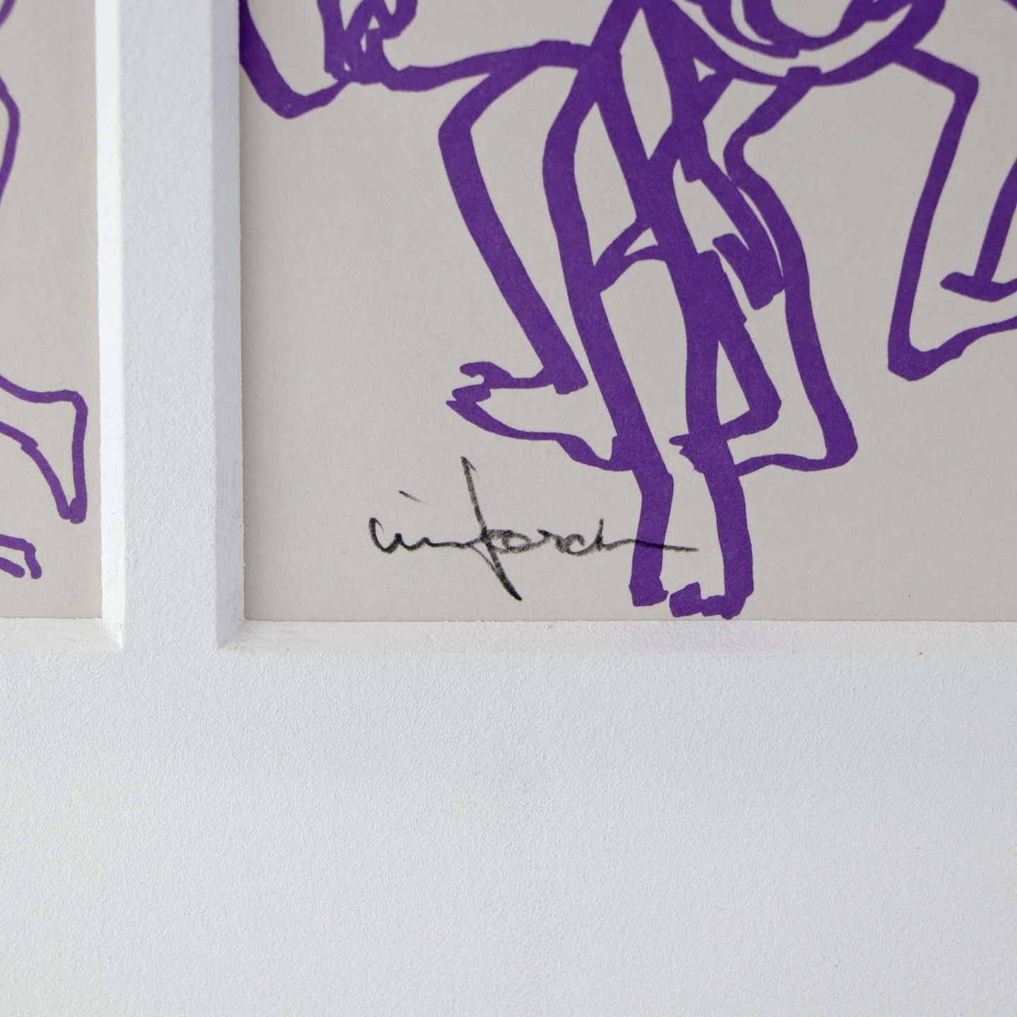 Litografi med passepartout i gråmalet træramme og motiv af mennekser i bevægelse i lilla streg.