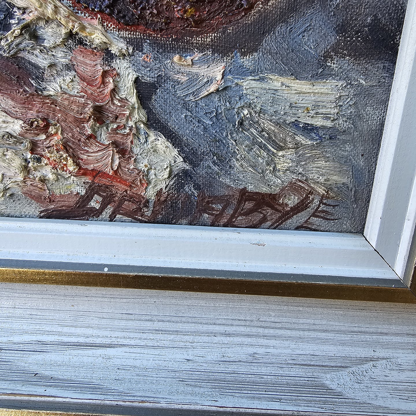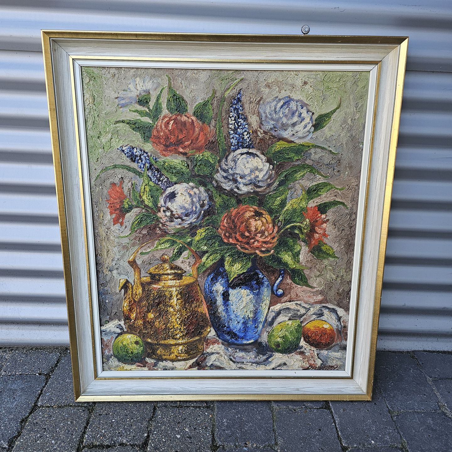 Oliemaleri på lærred monteret i hvid- og guldmalet ramme med motiv af en vase med blomster