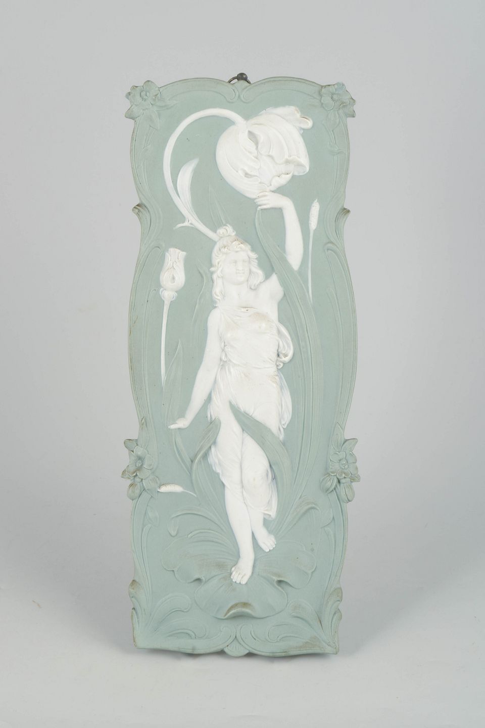 Dekorativt art nouveau vægrelief i lysegrøn jasperware med hvid reliefdekoration forestillende en kvindefigur i bevægelse omgivet af organiske blomsterformer. Fremstillet i biscuitporcelæn med fin detaljering og klassisk jugendstil udtryk. Bagside med ophæng og fabriksmærke.