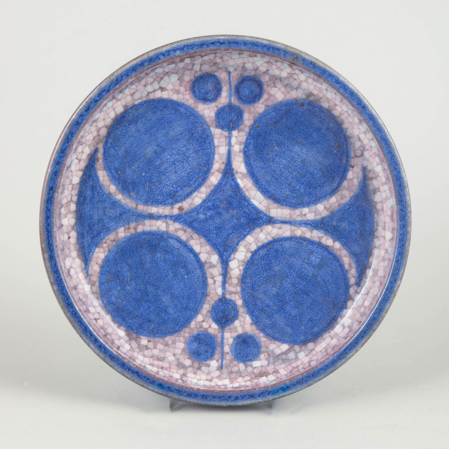 Dekorativt keramikfad i stentøj med cirkulært reliefmønster i blå glasur. Motivet består af gentagne ringformer med fin tekstur, typisk for Marianne Starcks arbejde for Michael Andersen & Søn. Stemplet i bunden.