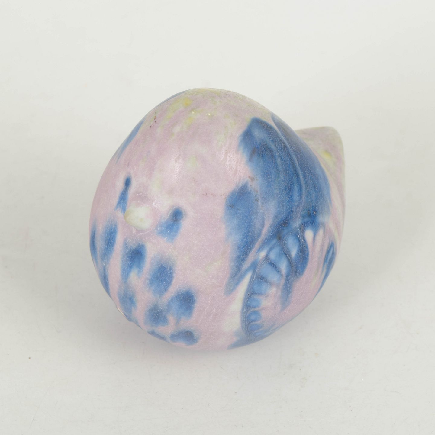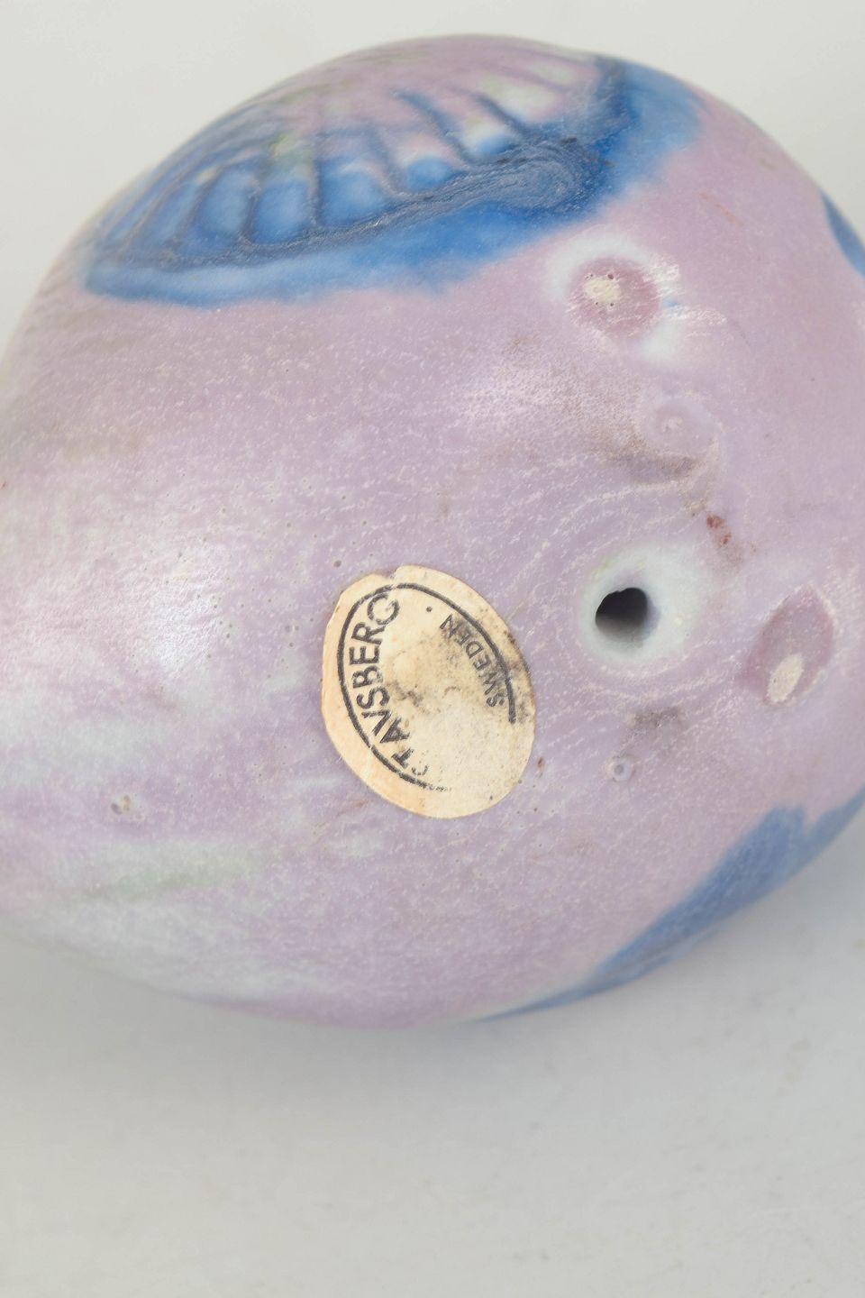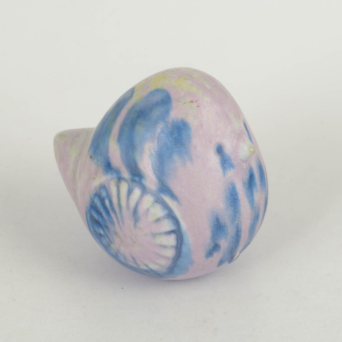 Dekorativ fuglefigur i stentøj med blødt afrundet form og håndmalet dekoration i lyserøde og blå nuancer. Mærket med Gustavsberg klistermærke.