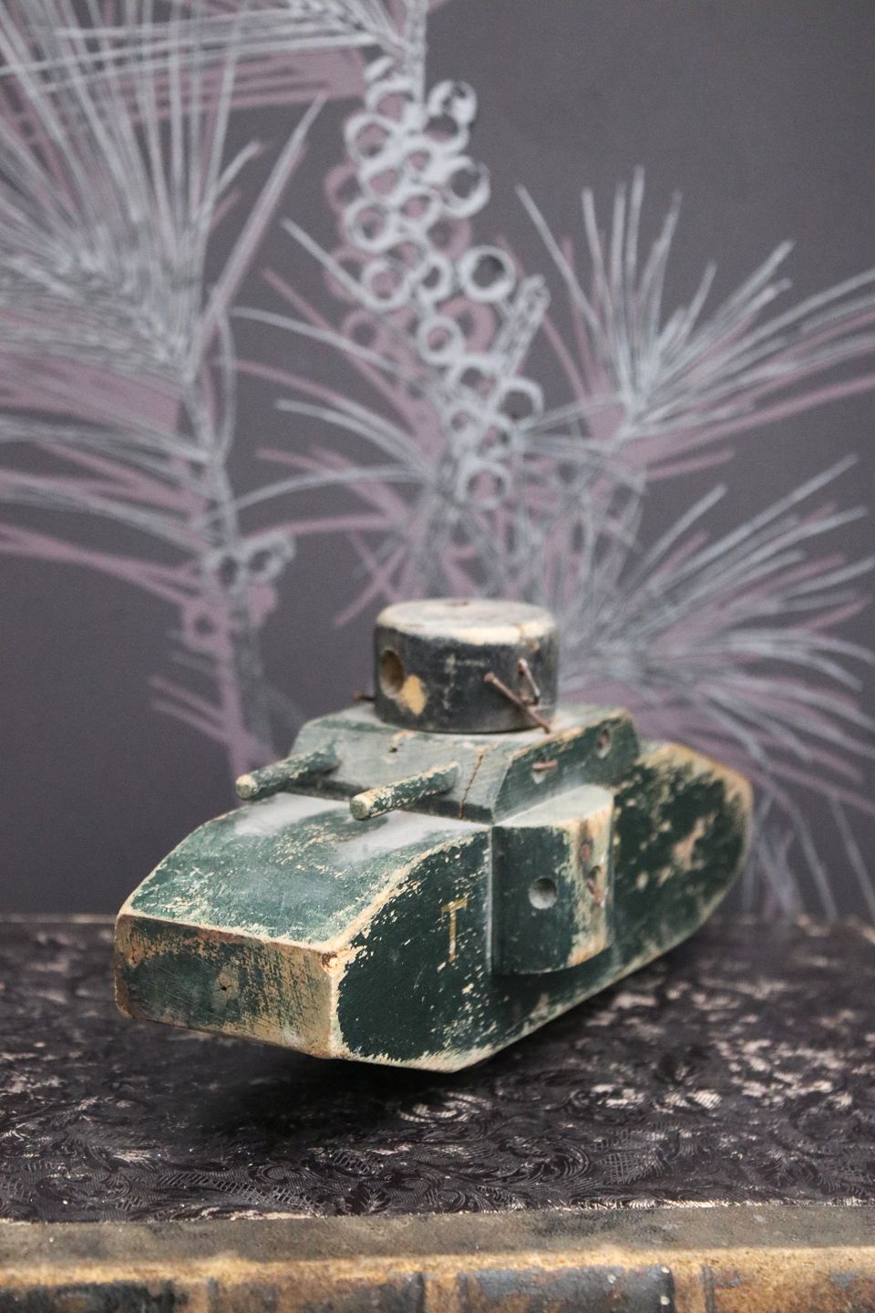 Dekorativ, gammel vintage kampvogn i grønmalet træ med en fin gammel patina.