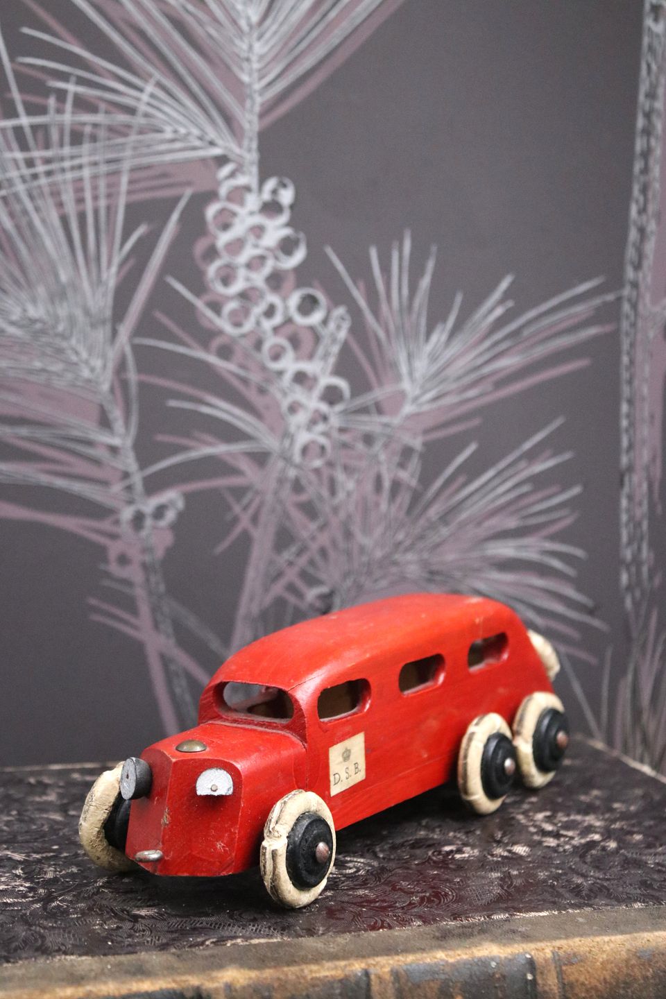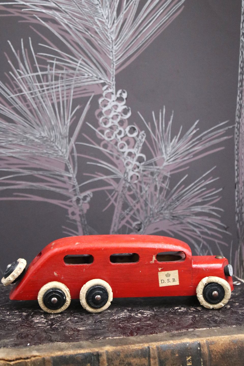 Dekorativ, gammel vintage rutebil i rødmalet træ med DSB skilt på døren og en fin gammel patina. H: 6,5cm. L: 22,5cm.