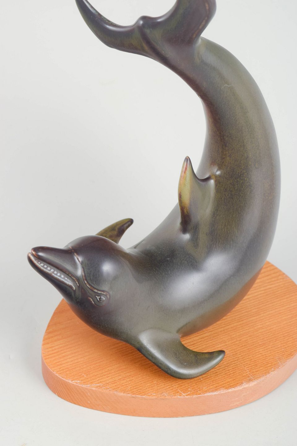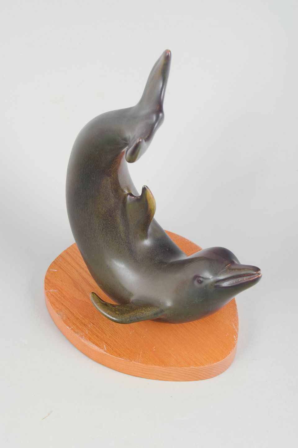 Stiliseret delfin udført i stentøj med blød, organisk form og dæmpet glasur i grønlige og brunlige nuancer. Figuren er monteret på original træbase.
