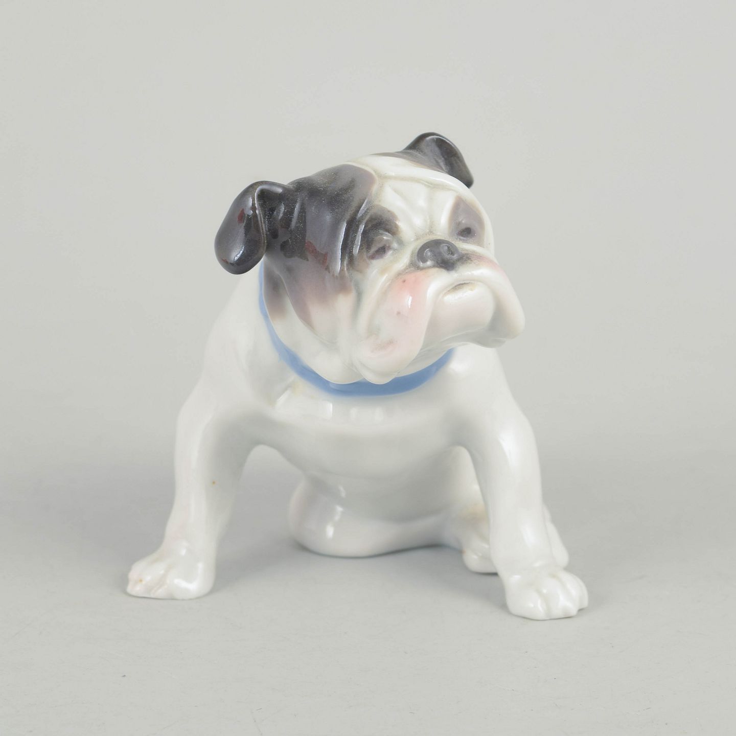 Naturalistisk udformet porcelænsfigur af fransk bulldog med håndmalede detaljer i grå, hvide og rosa nuancer.