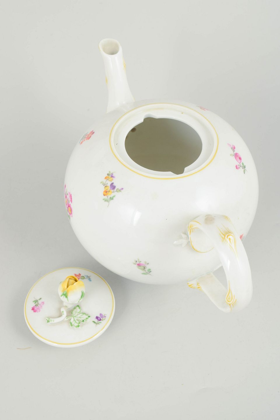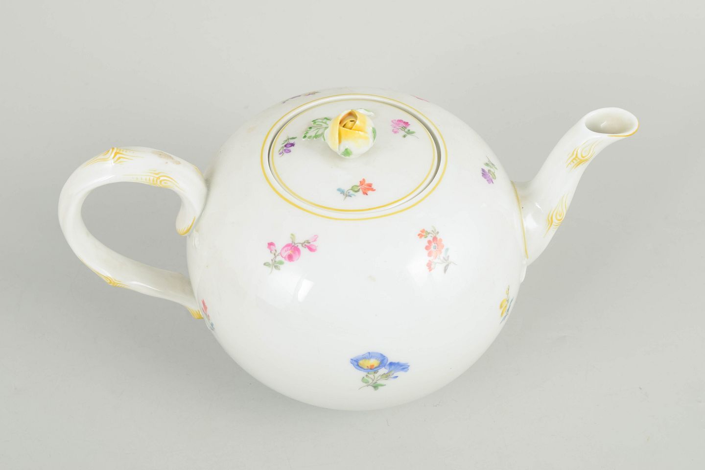 Porcelain teapot hand painted with polychrome flowers and decorated with a gilt rim. Rounded body with curved spout and elegant handle, complete with lid and finial, executed in classic Meissen style from the mid 20th century. Marked on the base with Meissen crossed swords, first factory quality.