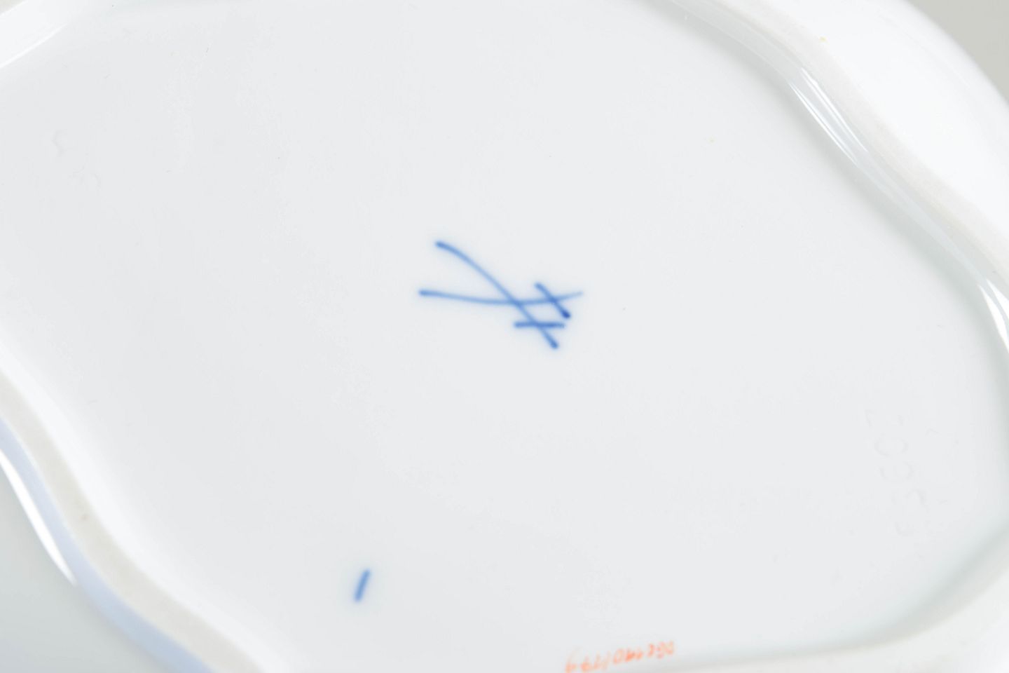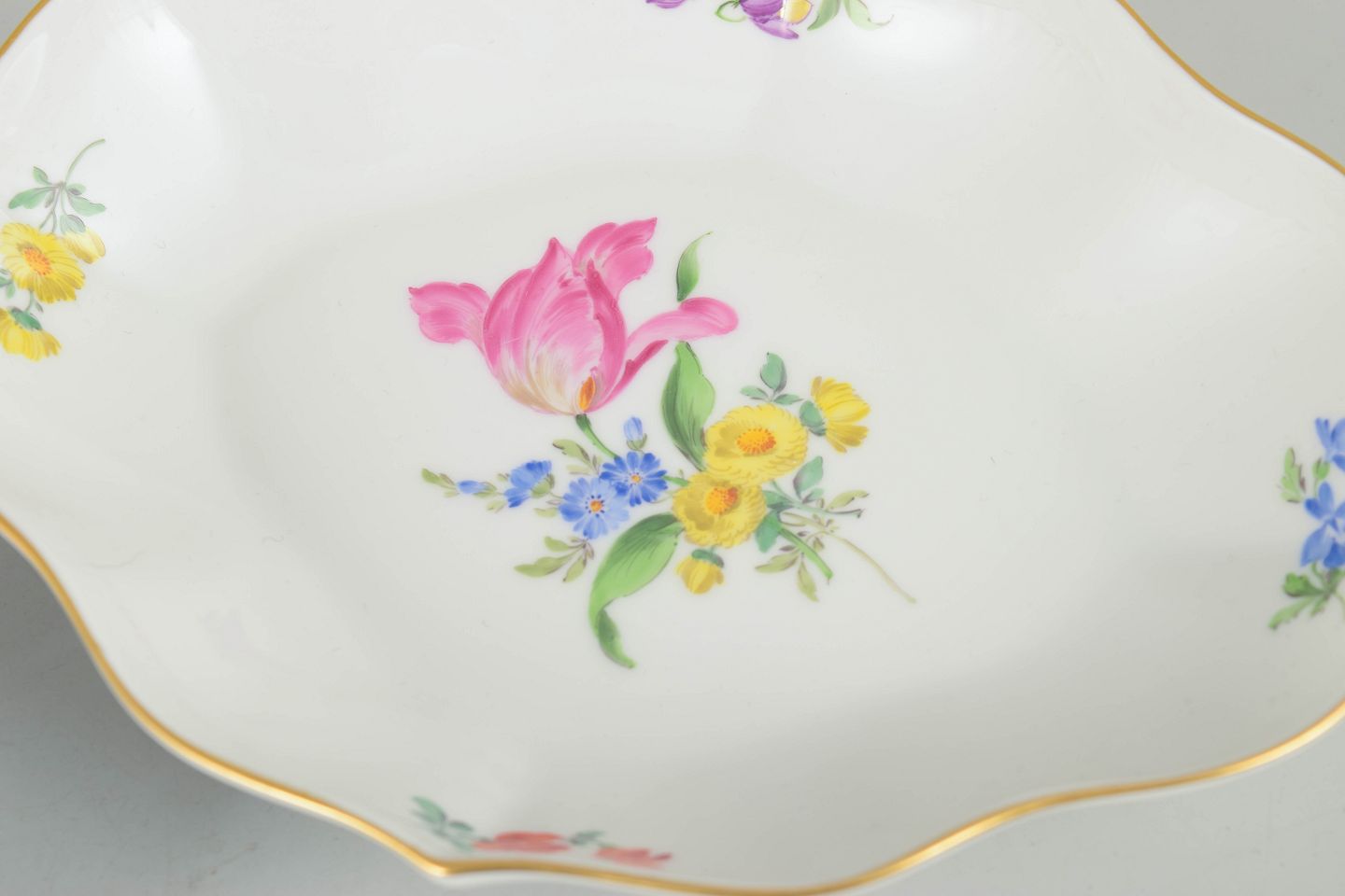 Set of two porcelain dishes hand painted with polychrome flowers and decorated with gilt rims. Classic Meissen forms with gently scalloped edges from the mid 20th century. Both marked with Meissen crossed swords, one in first factory quality and the other cancelled with two incised lines.