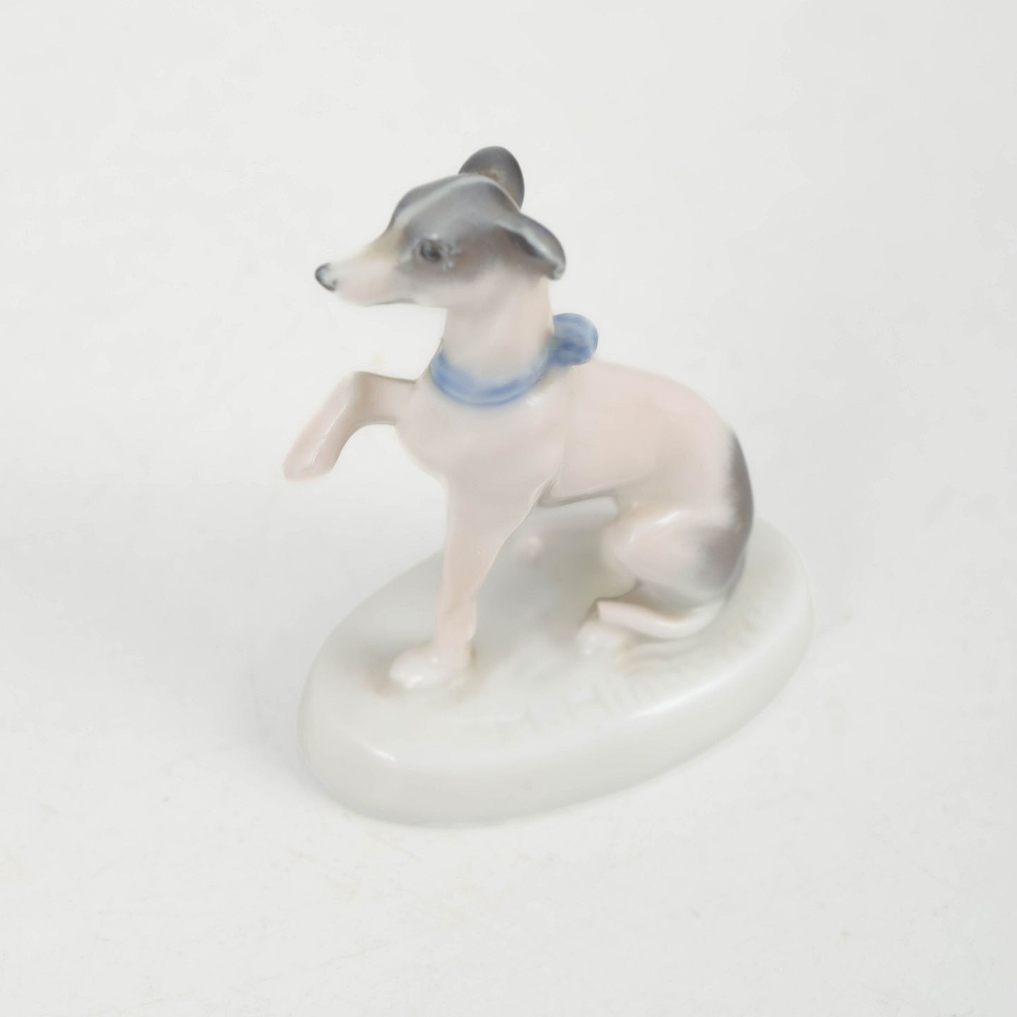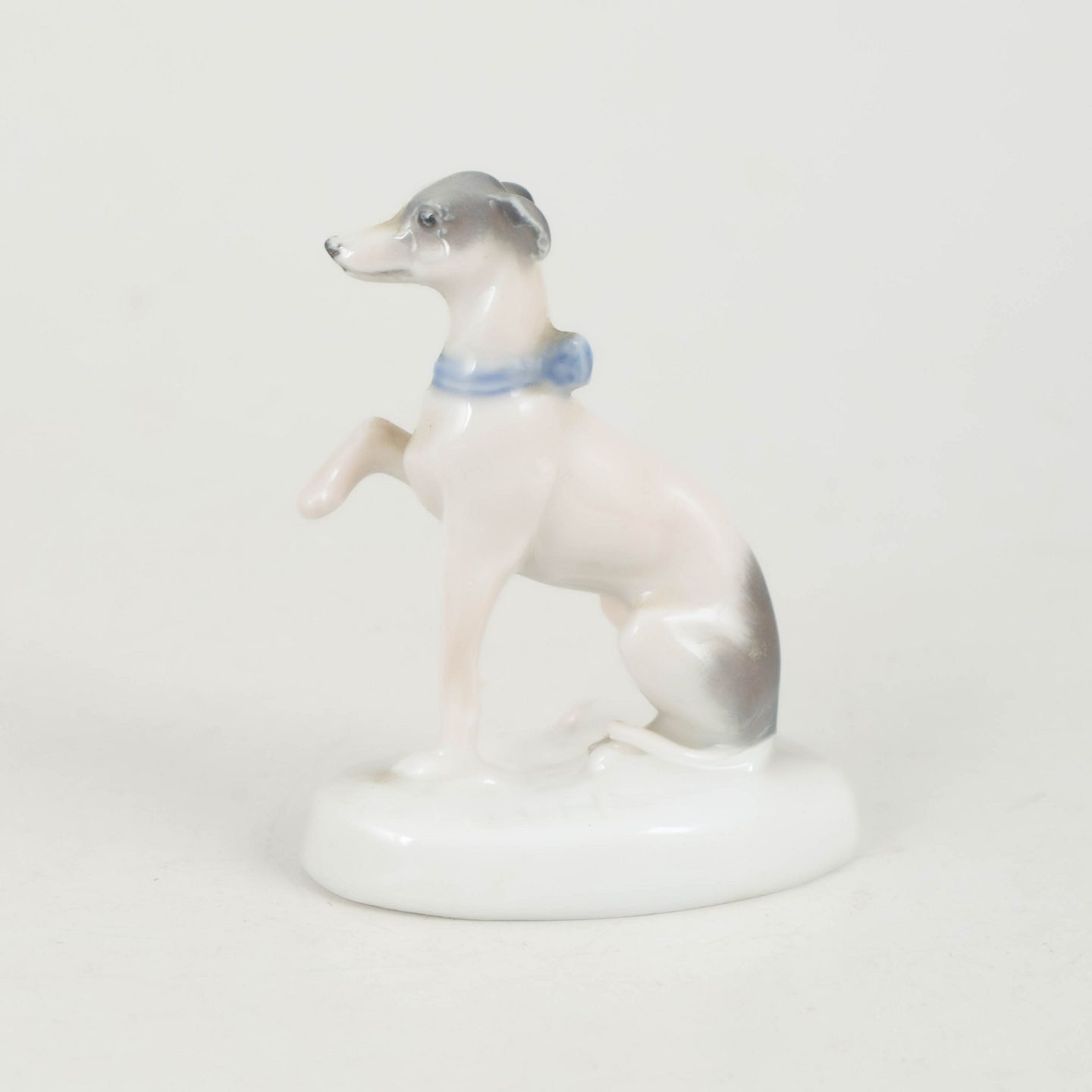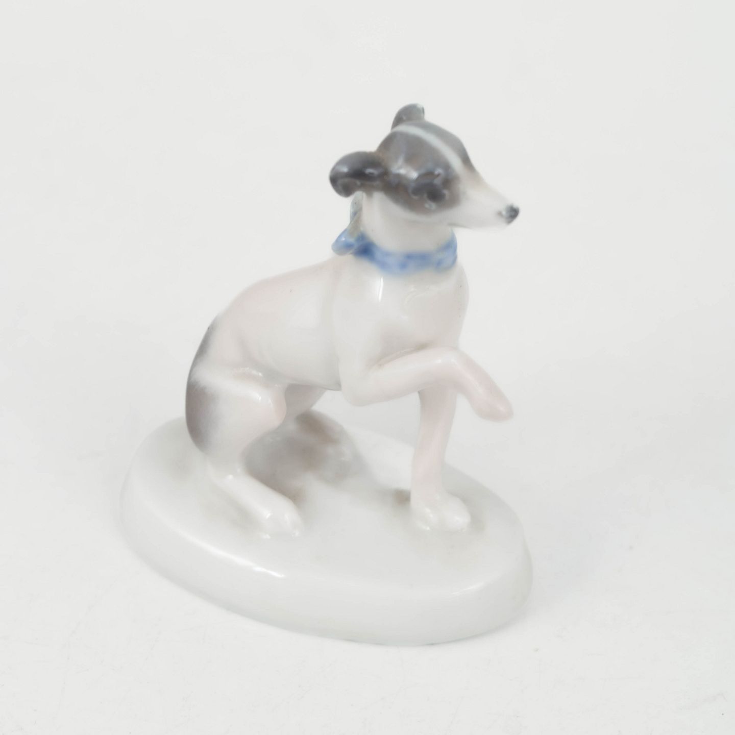 Fin naturalistisk porcelænsfigur af en siddende mynde med hævet forpote og elegant slank form. Udført med bløde glasurovergange i lyse toner og signeret R. Sh., fremstillet hos Rosenthal i perioden omkring 1927.