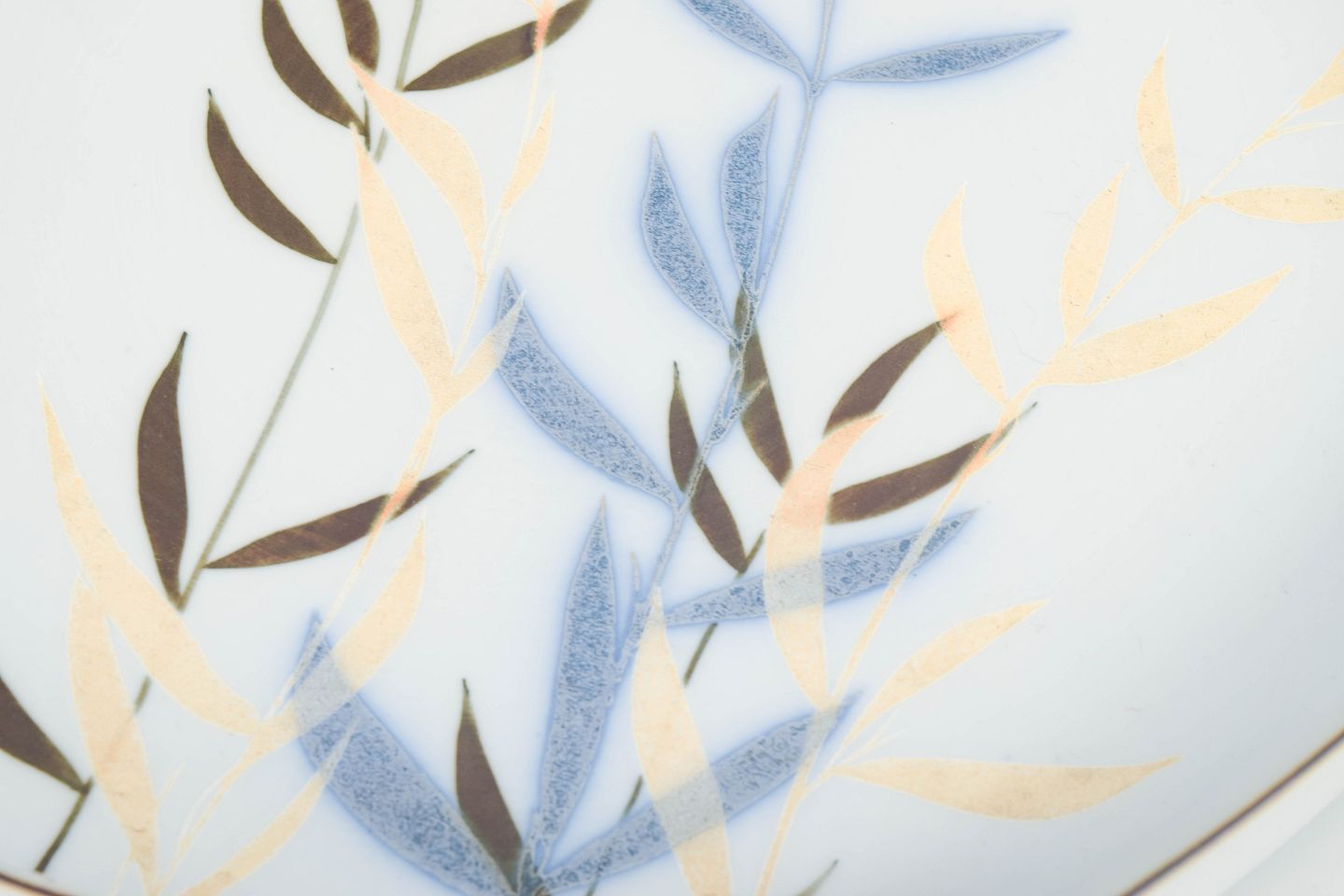 Stort ottekantet porcelænsfad med stiliseret bambusdekoration i blå, gyldne og brune nuancer. Model 22781, første sortering.