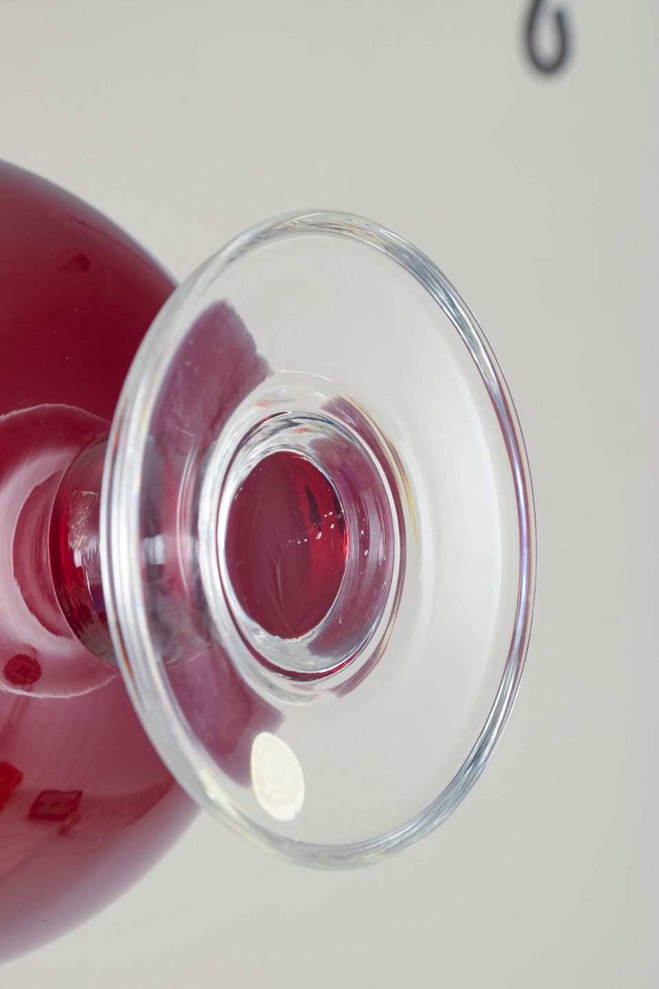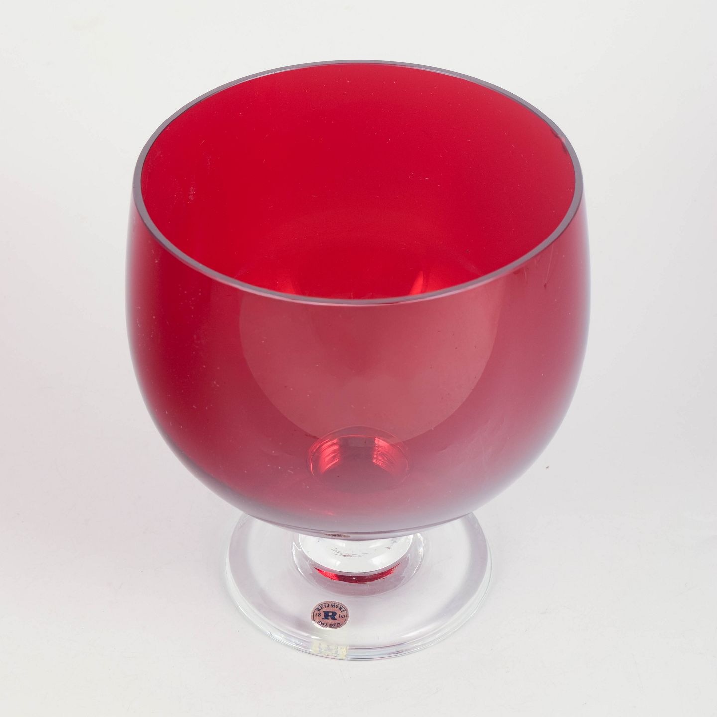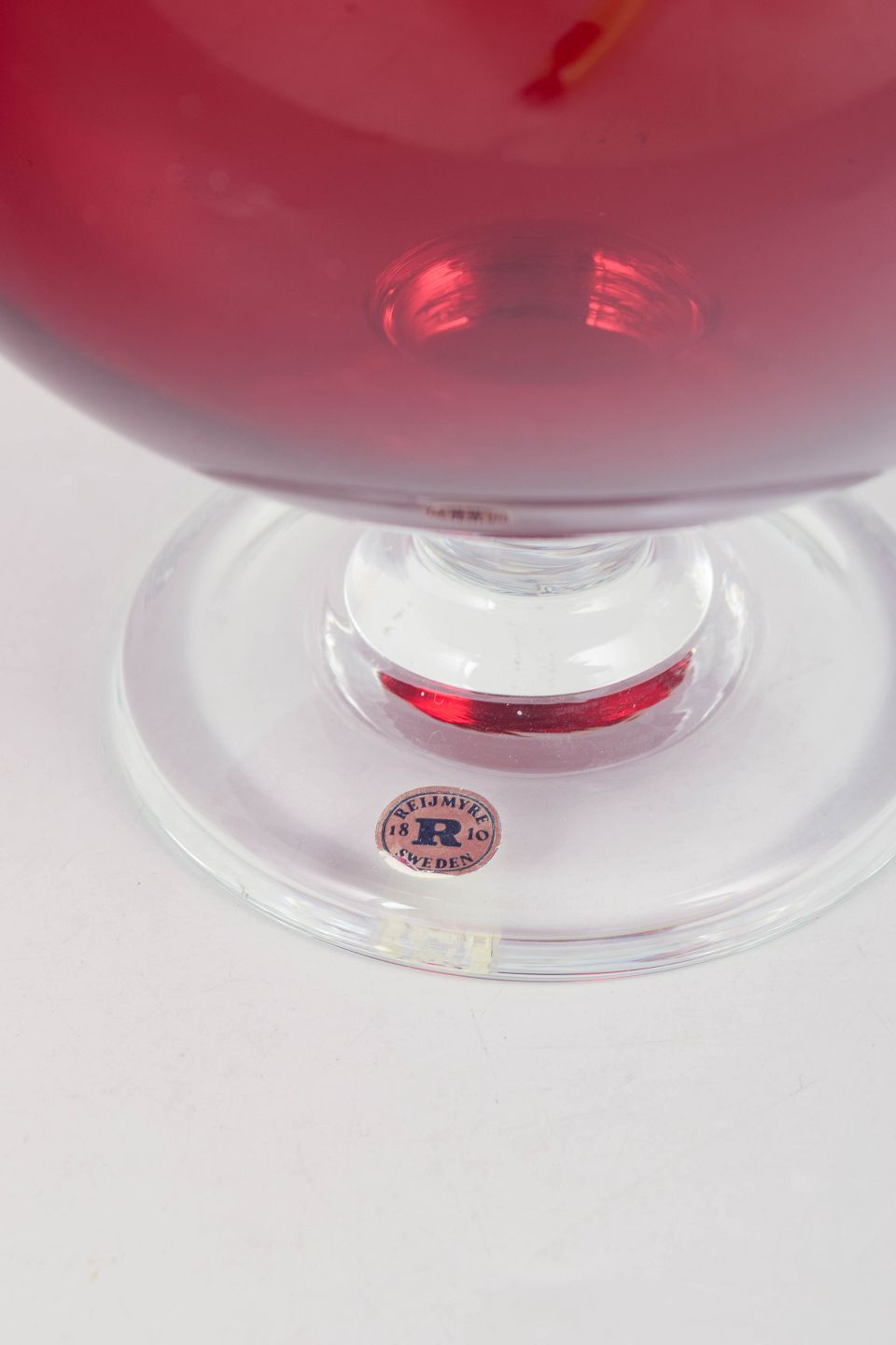 Mundblæst glas i klar og rød farvetone med rund kumme og kort stilk på bred fod. Original mærkat fra Reijmyre Glasbruk bevaret.