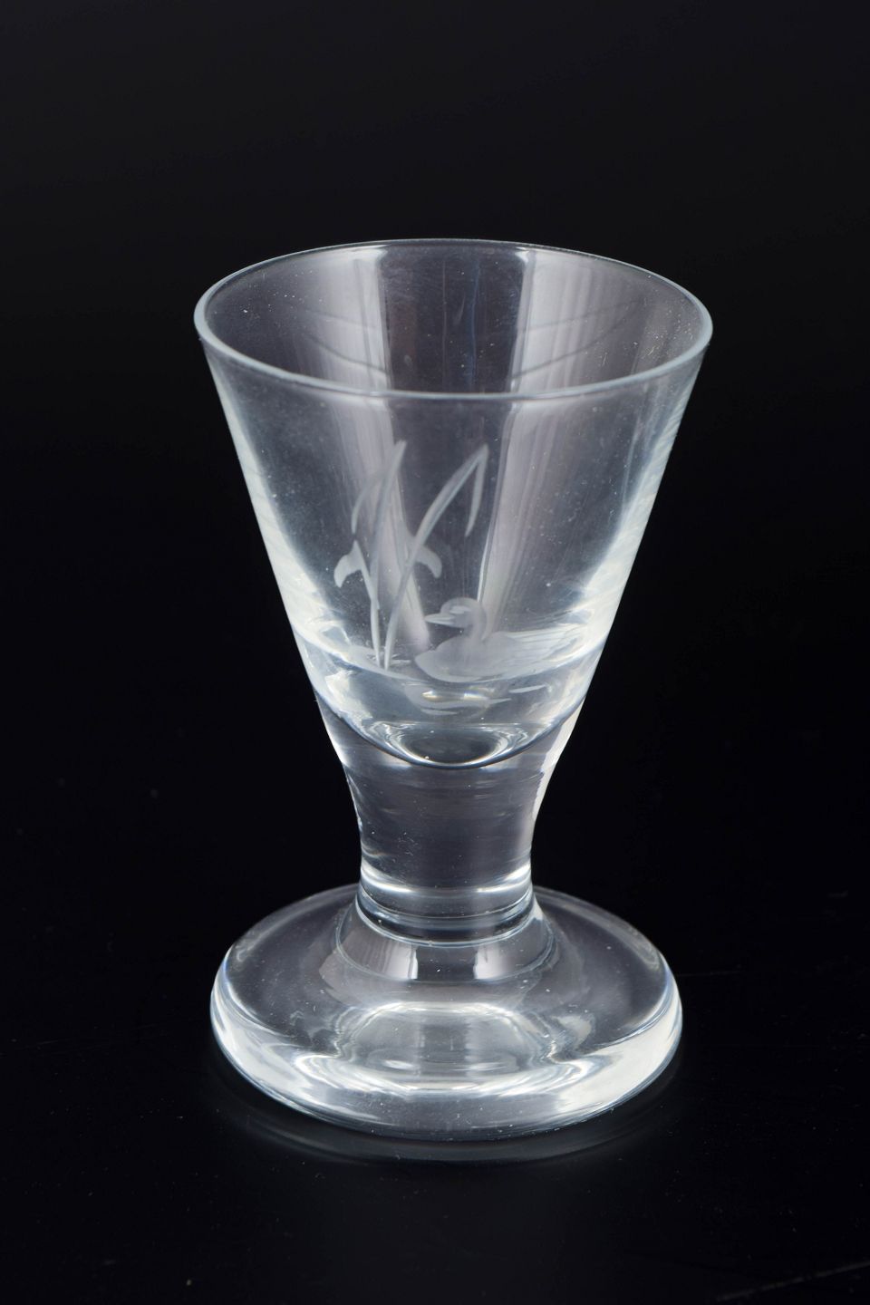 Mundblæste snaps glas med slebet dekoration af ænder og siv i klart glas, udført i klassisk mellemkrigstidsstil med konisk kumme og massiv fod.