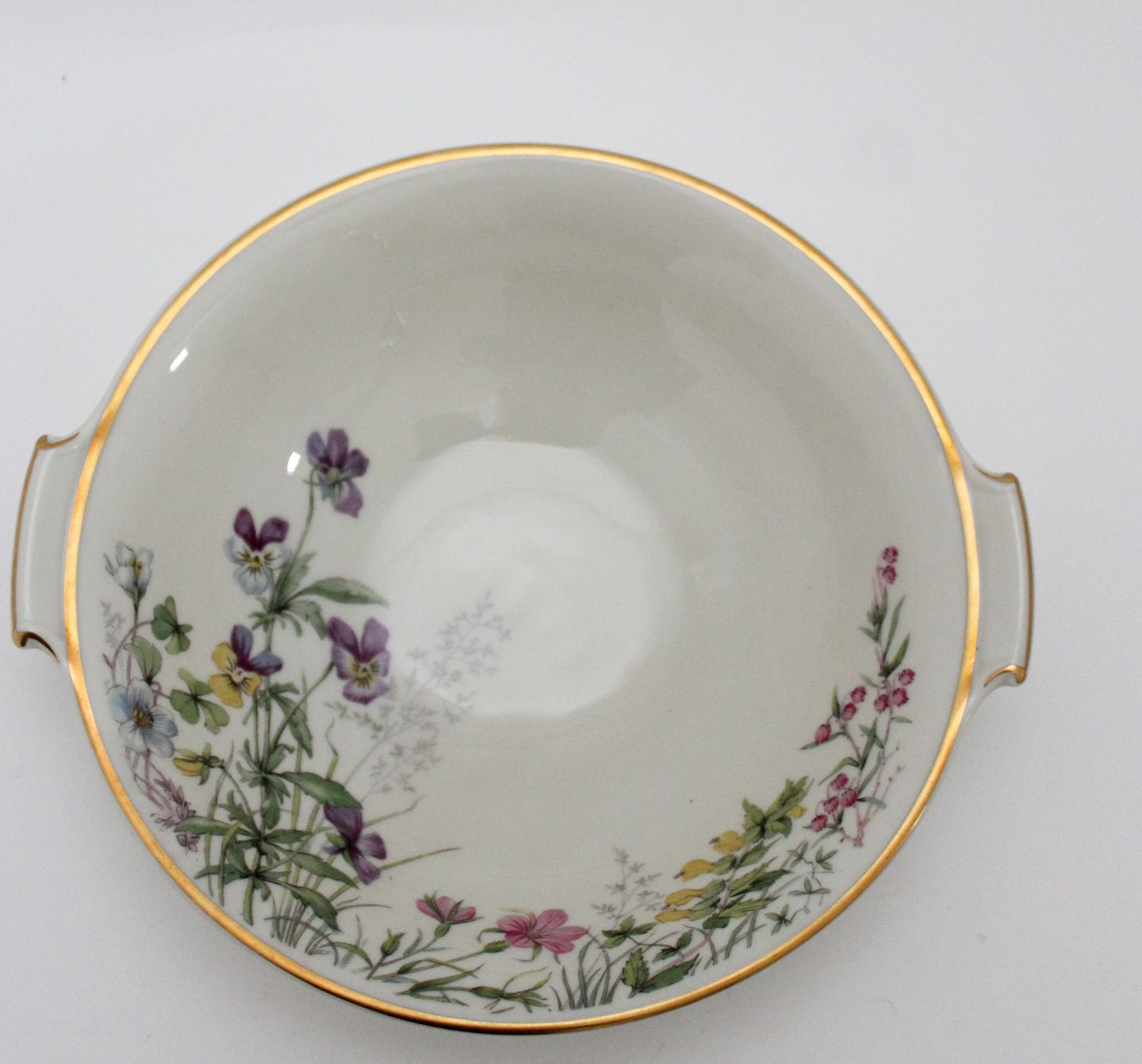 Skål med ører, motiv lilla stedmoderblomst m.fl. Diameter 18 cm. Længde 20 cm. Højde 5 cm. Pris: 175 kr. stk. Lager: 1