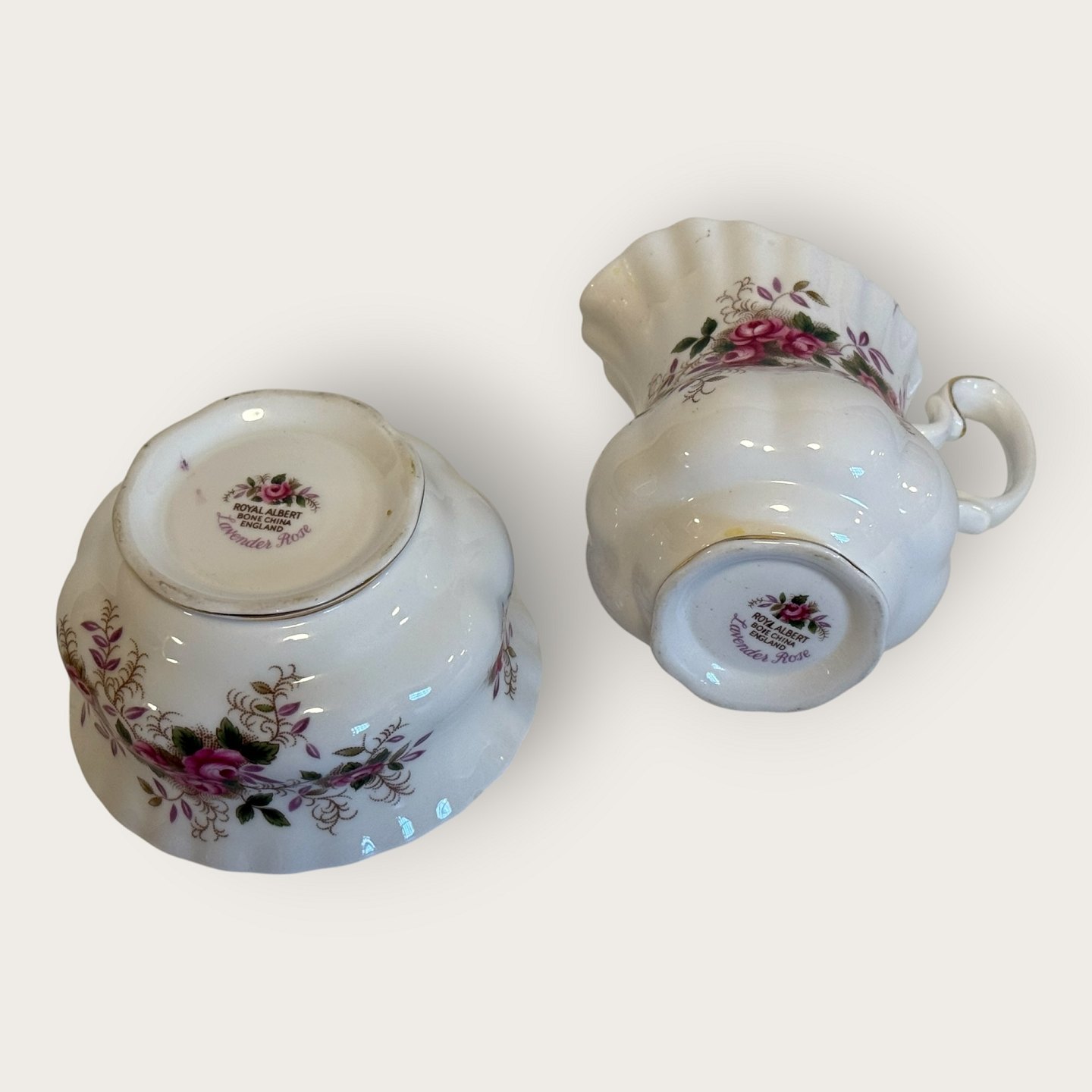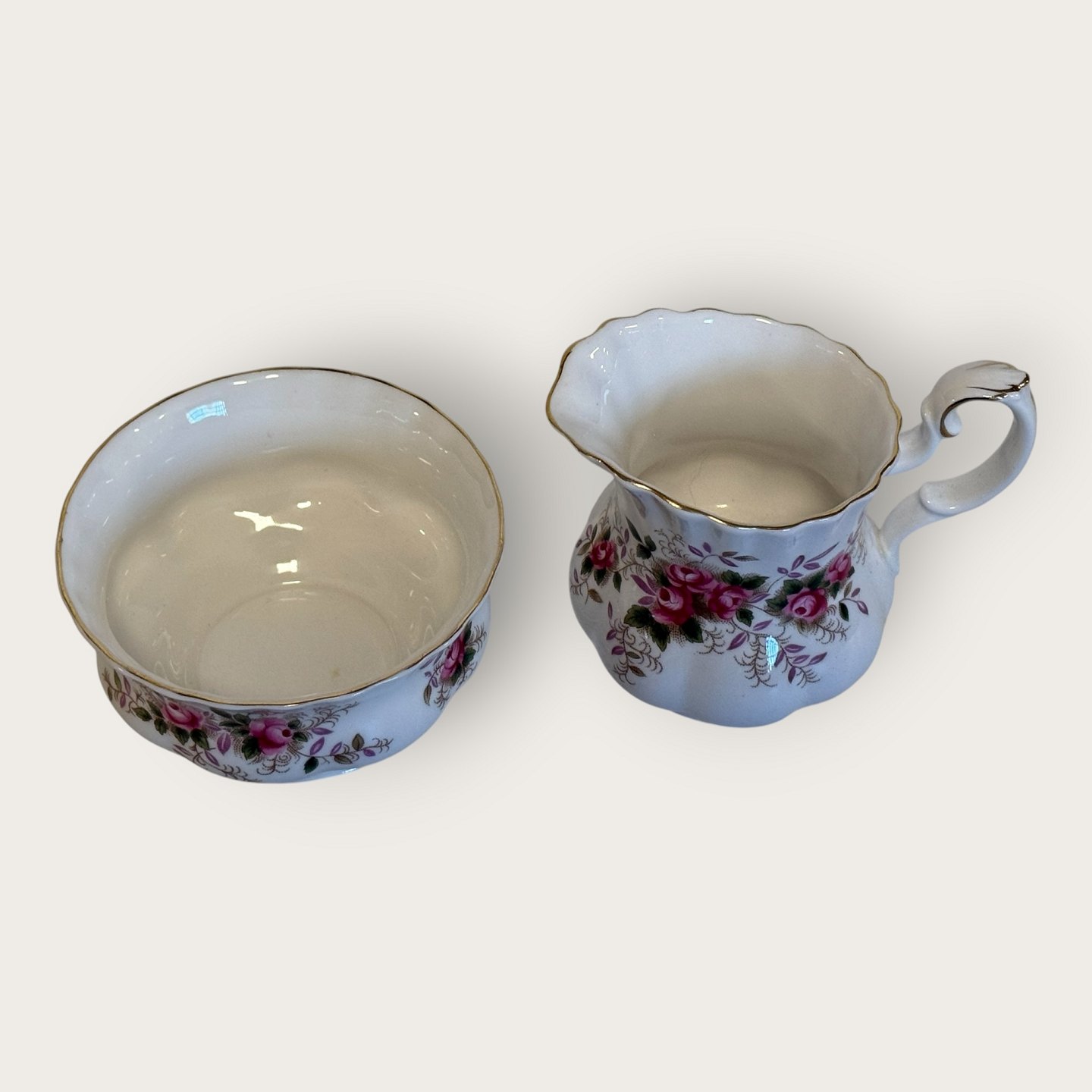 Royal Albert, Bone China, Lavender Rose, Sukker og flødesæt, sukkerskål højde 5,5cm, diameter 9,5cm, flødekande ca. hxbxl 9x10x7cm *Perfekt stand*