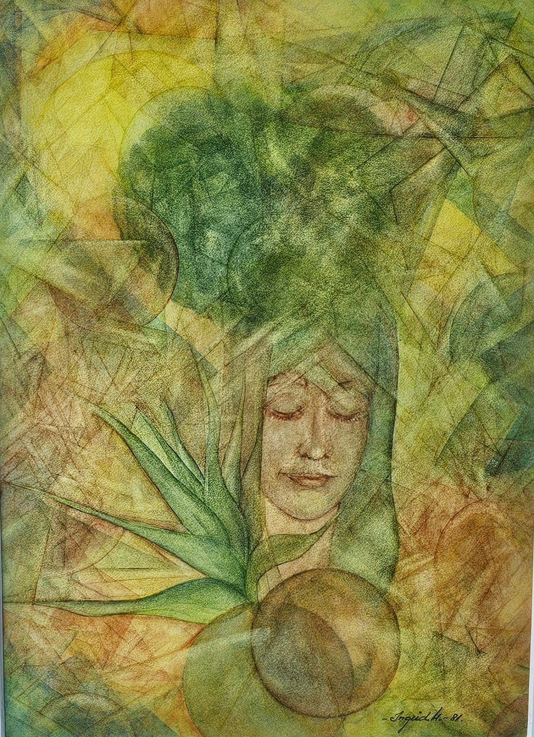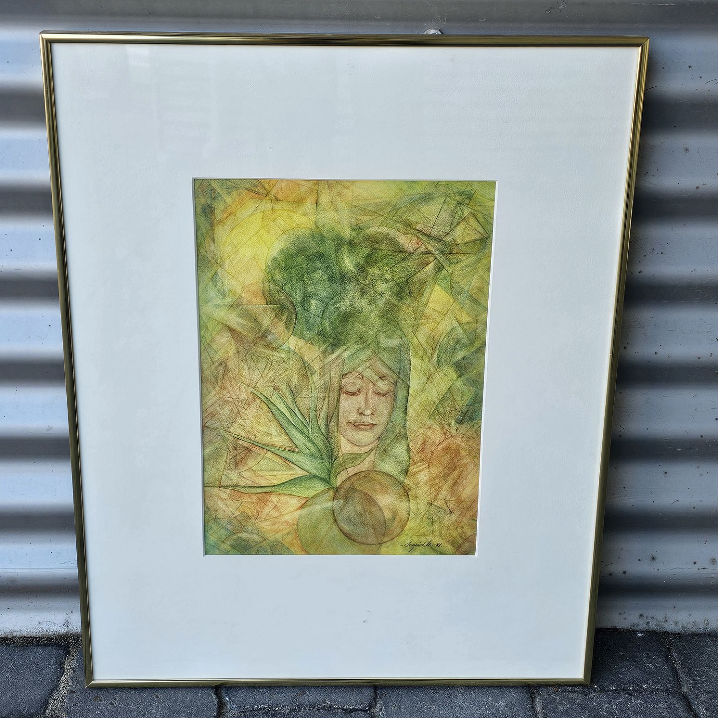 Tryk på papir med motiv af en kvinde i grønne nuancer. Monteret i metalramme, dateret 1981