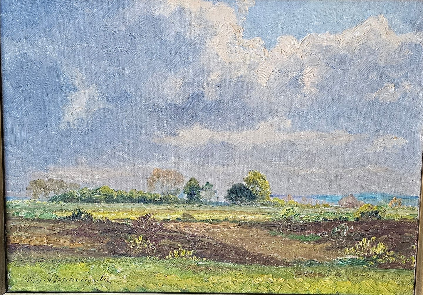 Oliemaleri på lærred med motiv af mark og himmel monteret i guldmalet træramme