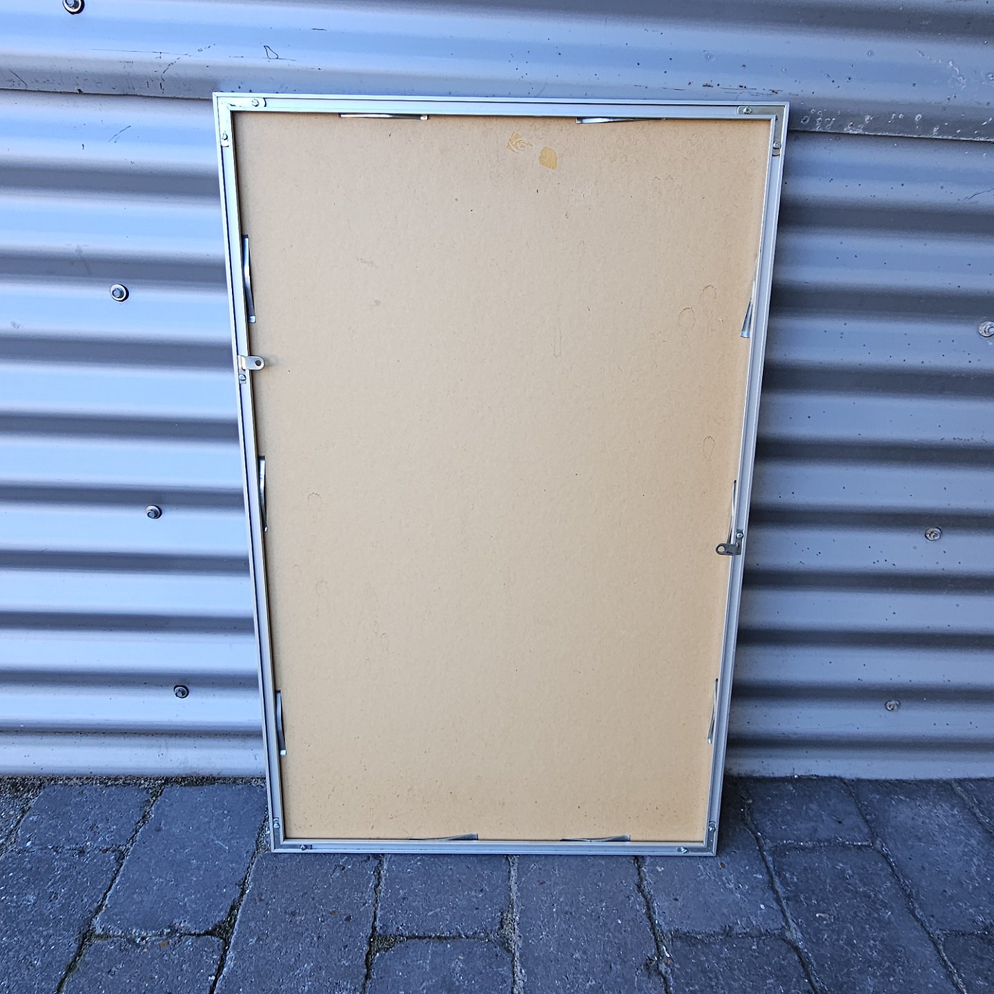 Litografi med abstrakt motiv af Kalvehave og Møensklint i blå, gul og hvid på lyseblå baggrund i metal ramme. 13/45