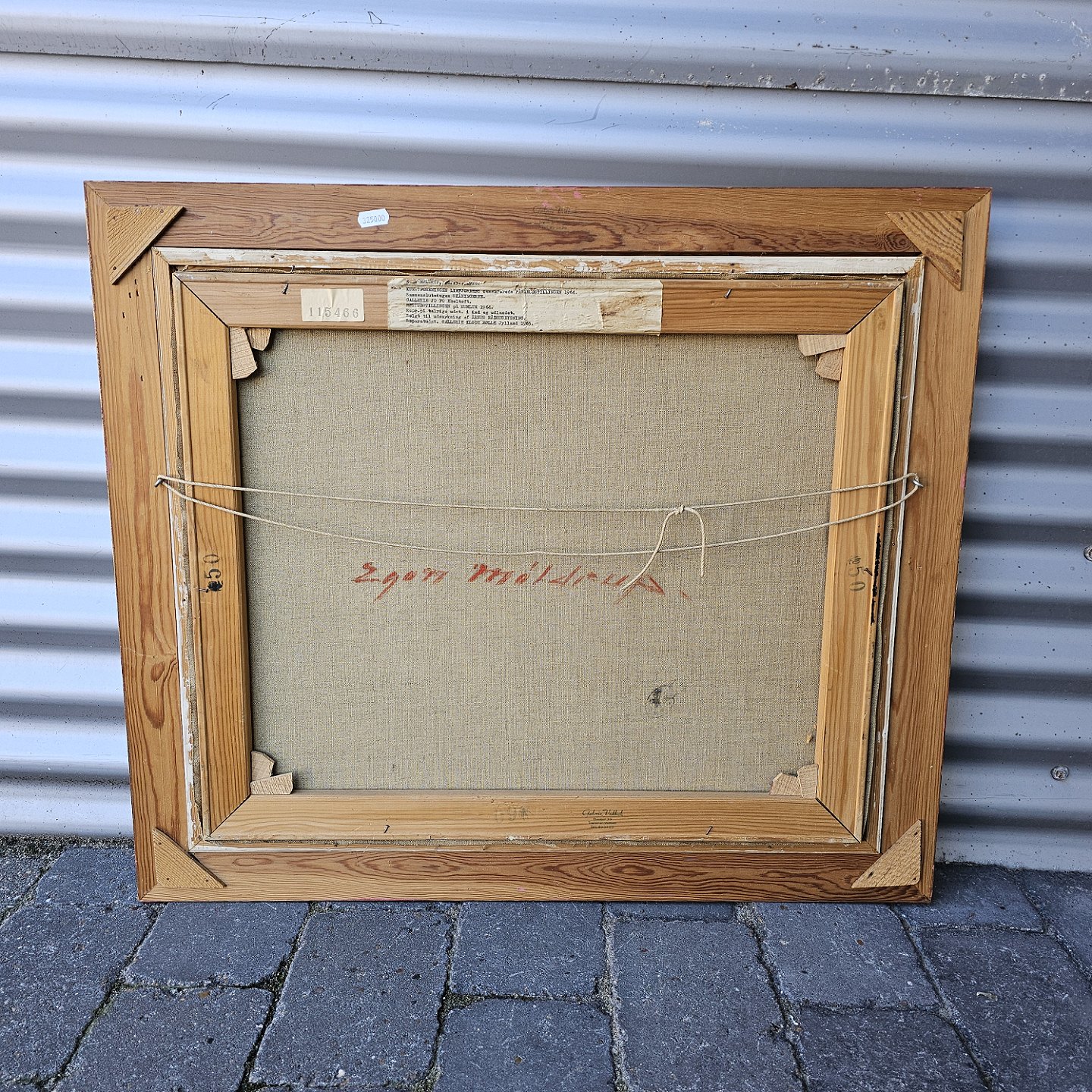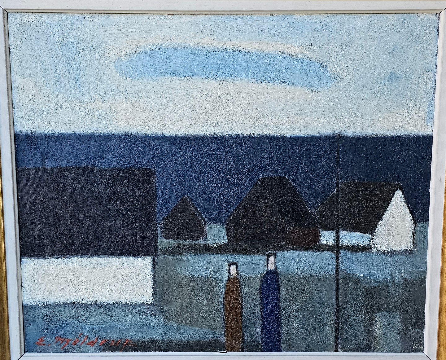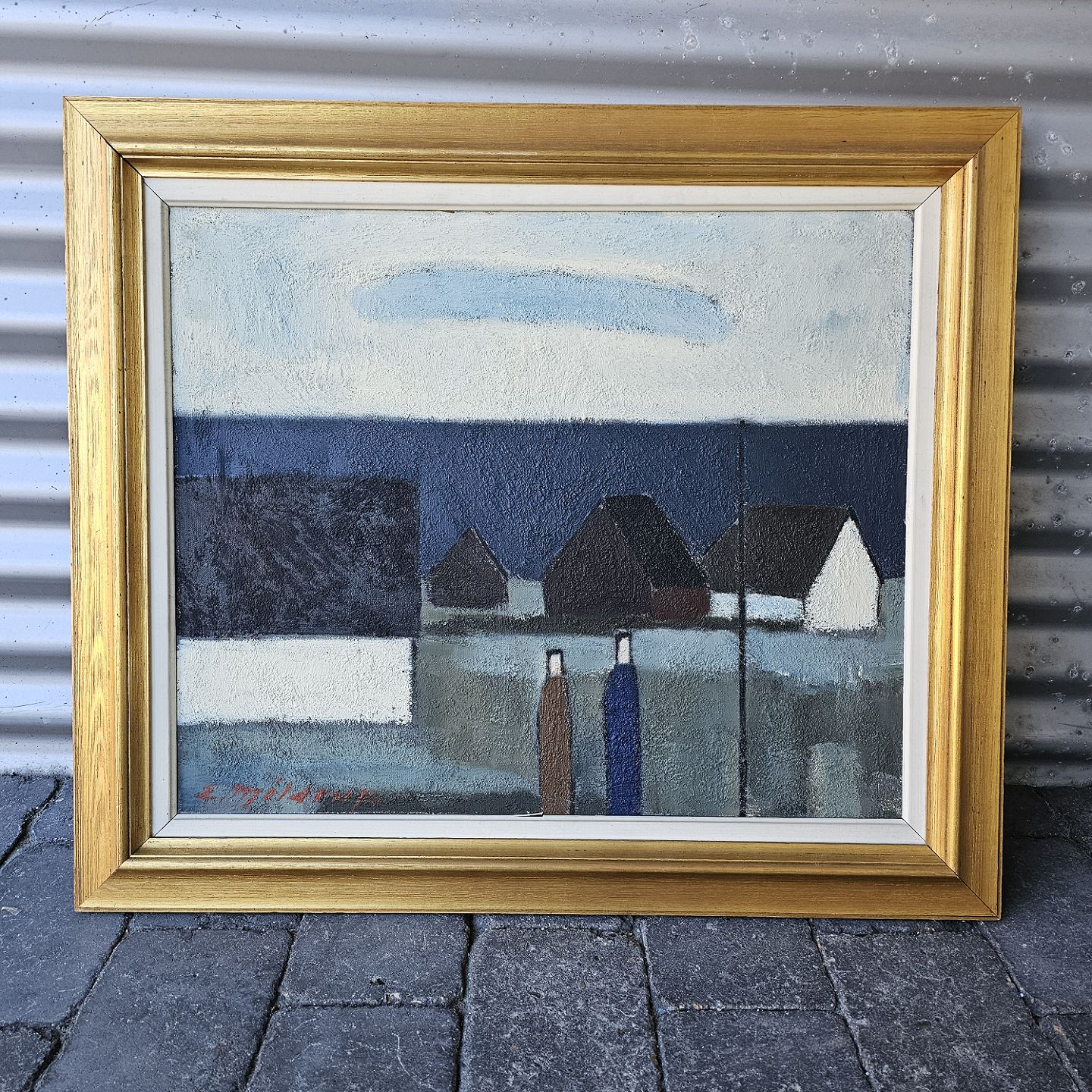 Oliemaleri på lærred monteret i guldmalet ramme med motiv af en lille landsby