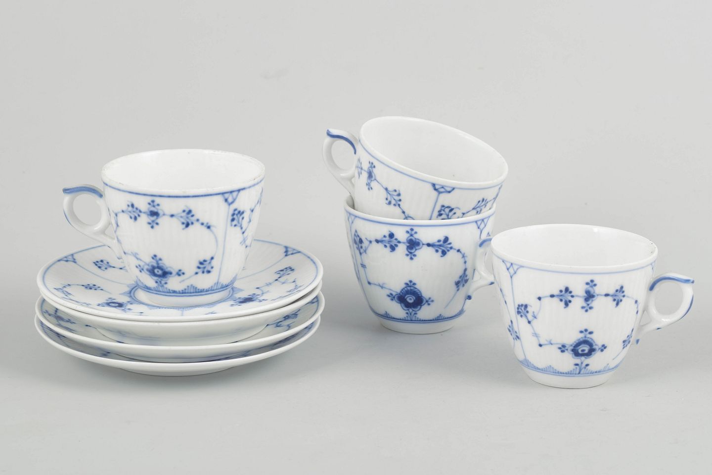 Royal Copenhagen Musselmalet Riflet, sæt af fire kaffekopper med underkopper.