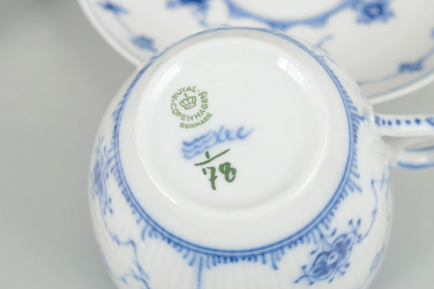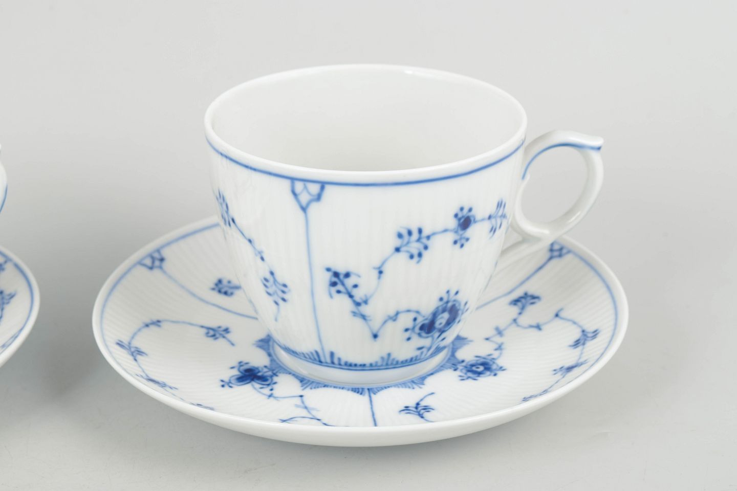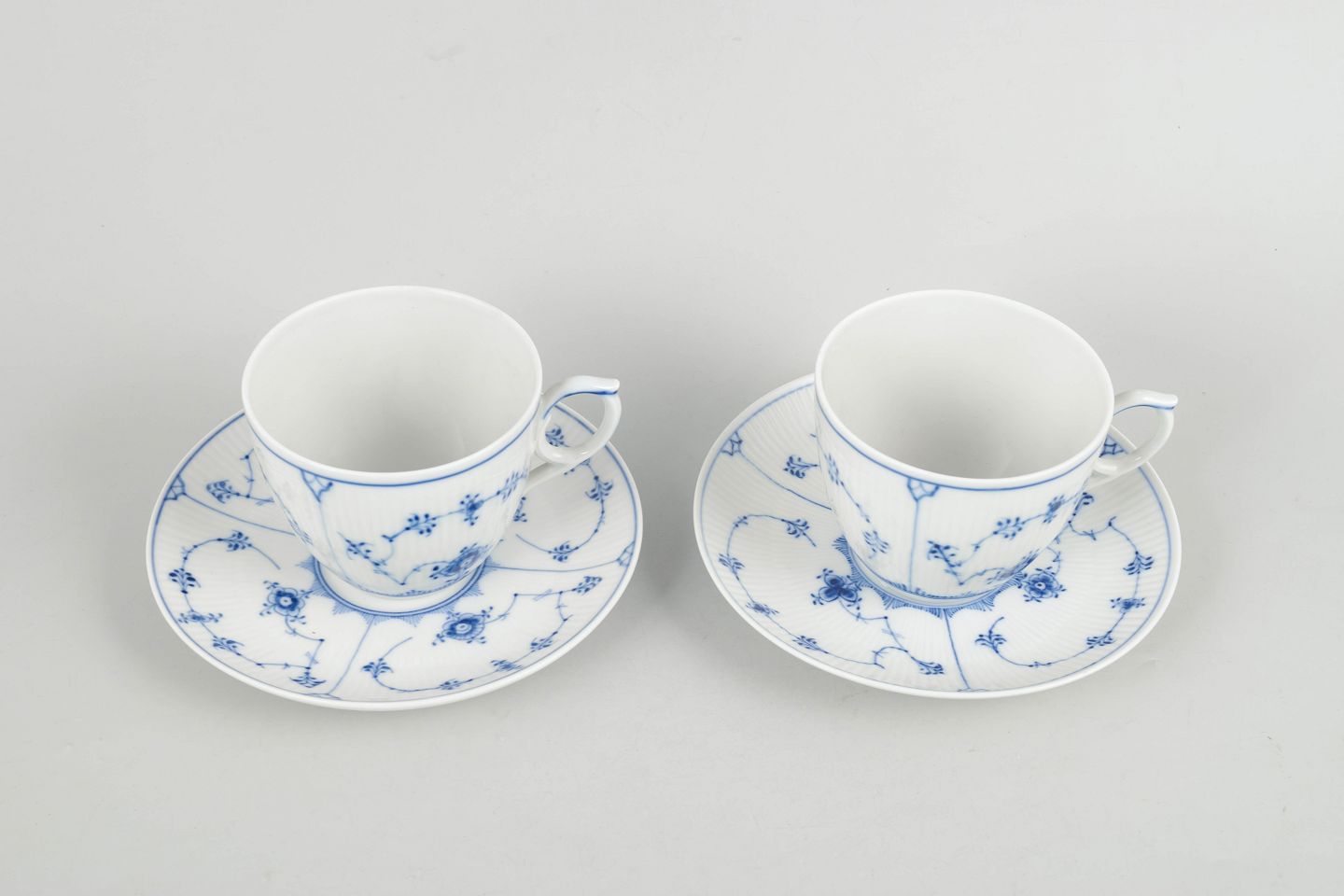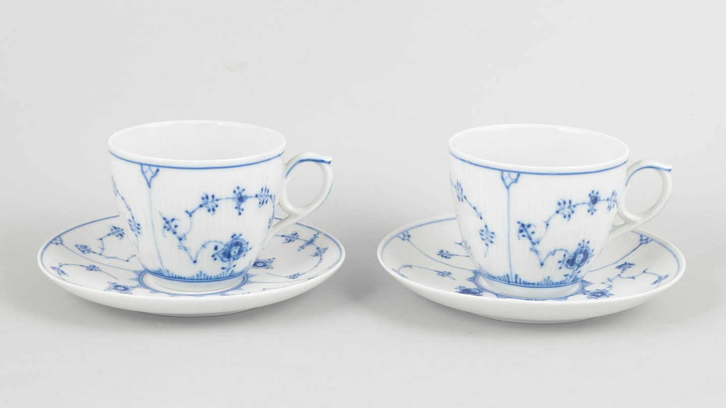 Royal Copenhagen Musselmalet Riflet morgenkopper med underkopper, par. Sjælden.
