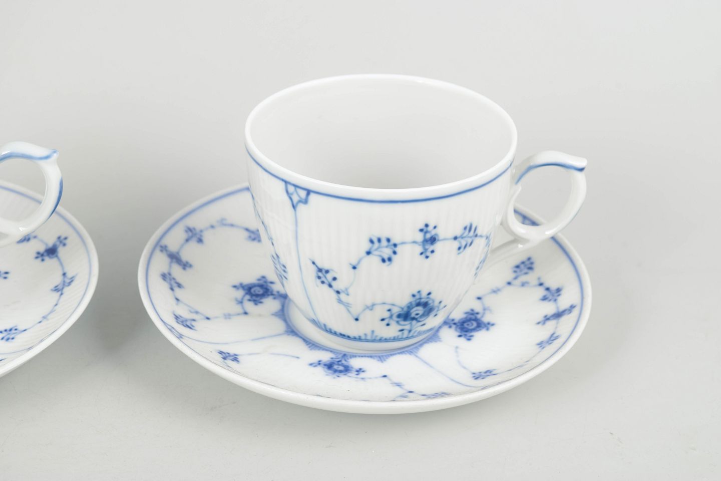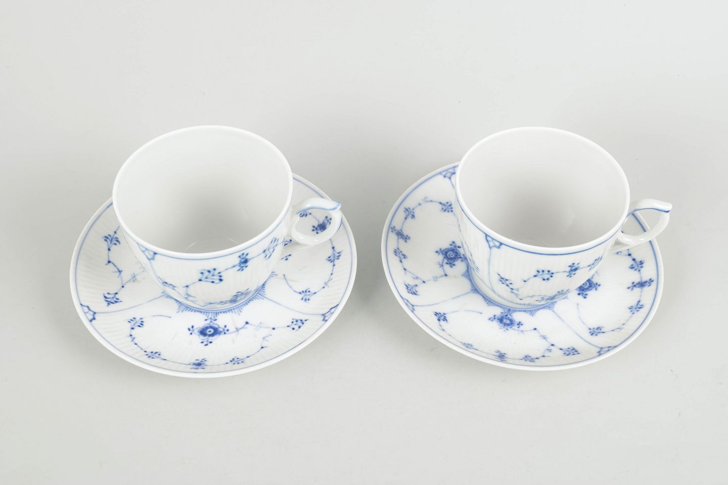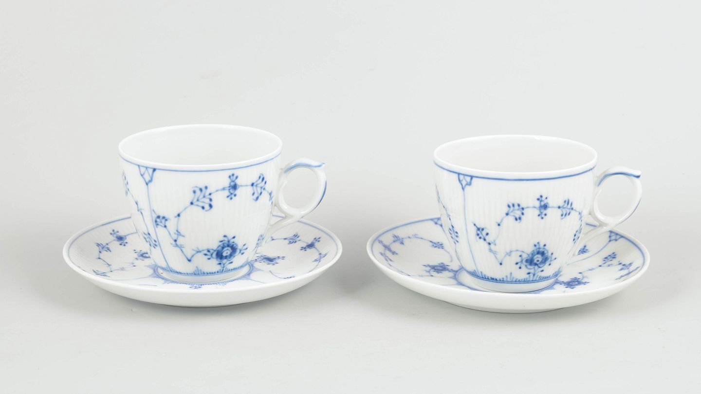 Royal Copenhagen Musselmalet Riflet morgenkopper med underkopper, par. Sjælden.