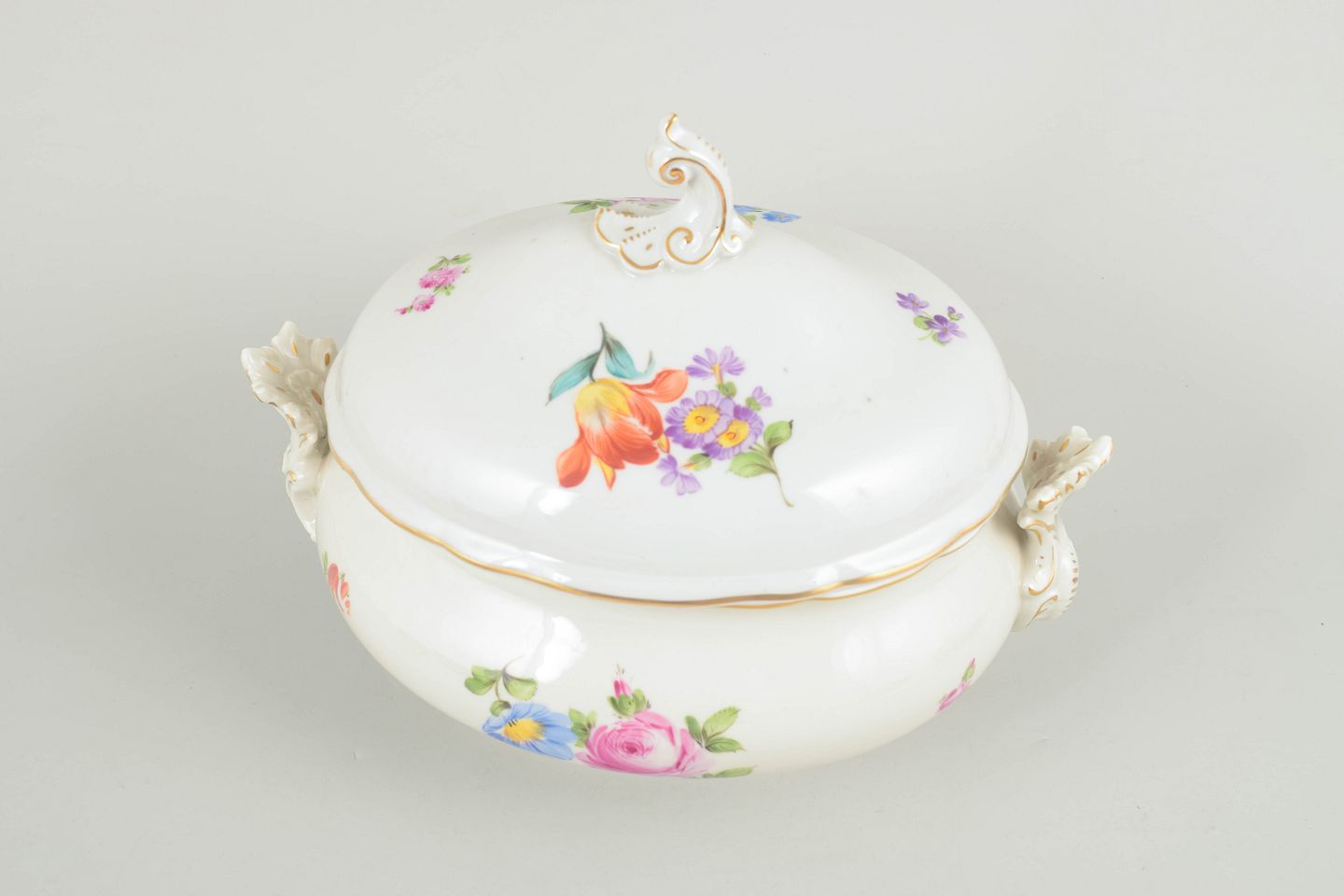 Large hand-painted porcelain tureen with polychrome floral decoration and gilt detailing, executed in the classic Saxon flower pattern. Unmarked.